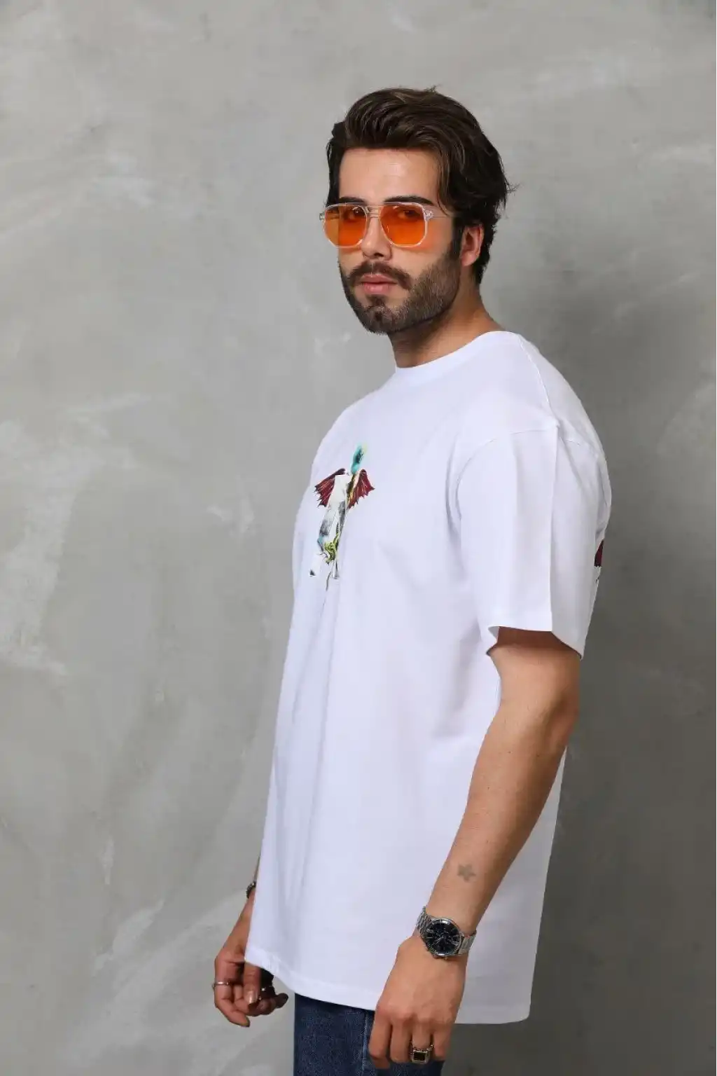 20/1 Penye Compack Ön Arka Ejder Baskılı Oversize Bisiklet Yaka T-shirt - Beyaz