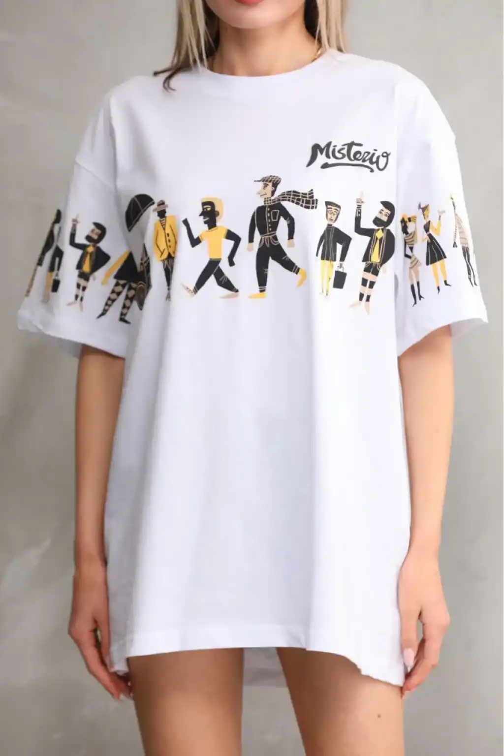 Unisex Bisiklet Yaka Baskılı Oversize T-Shirt - Beyaz