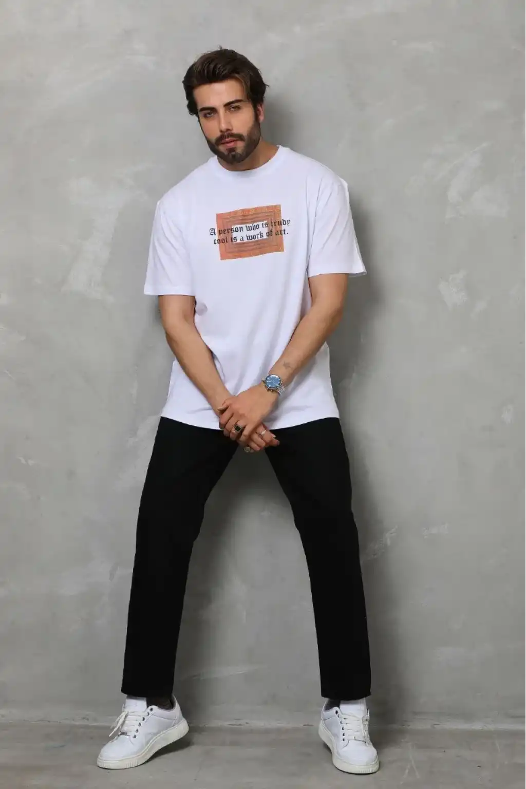 Unisex Bisiklet Yaka Baskılı Oversize T-Shirt - Beyaz