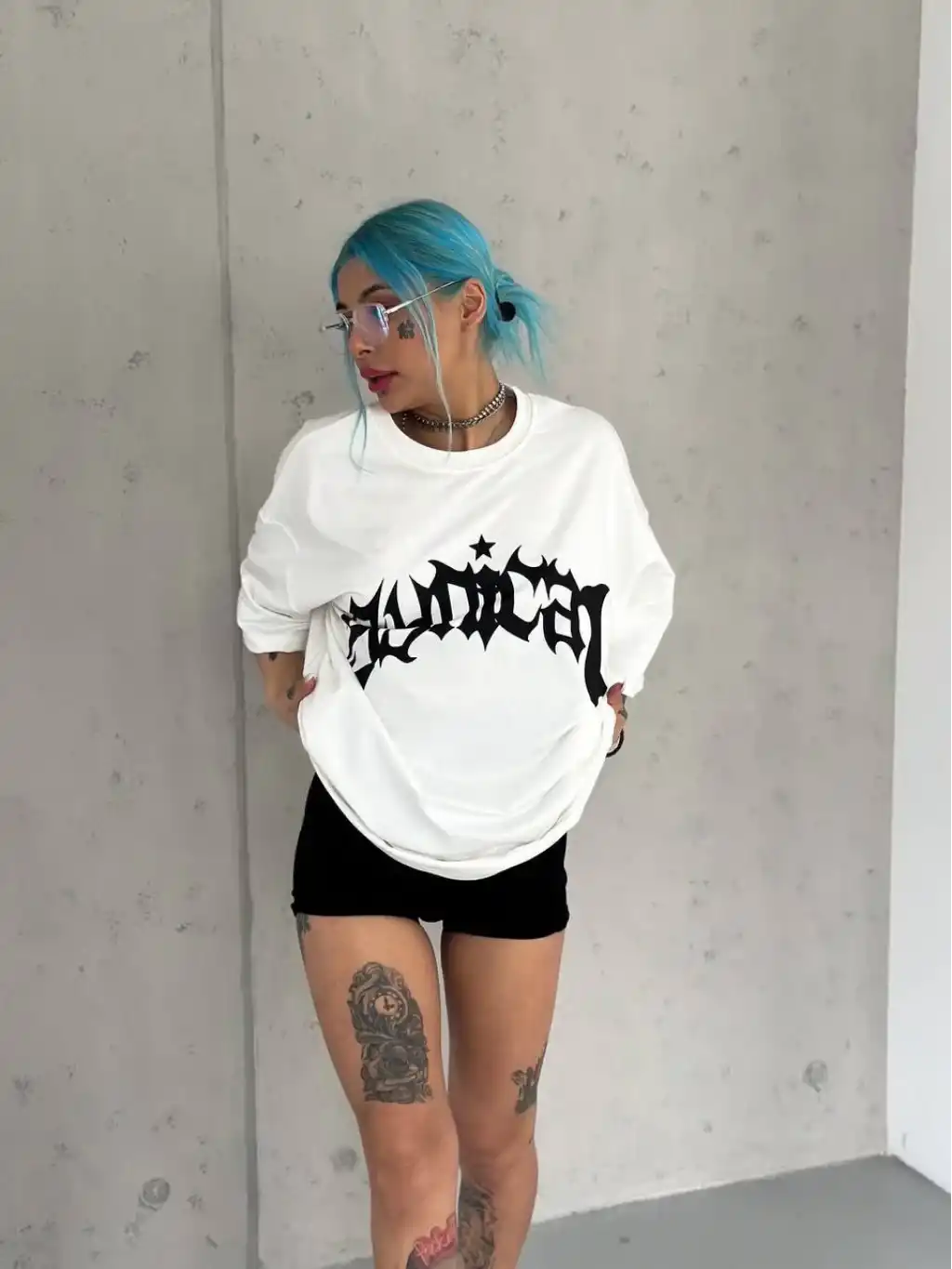 AICG Ön Arka Baskılı Bisiklet Yaka Kadın Oversize Bisiklet Yaka T-shirt - Beyaz