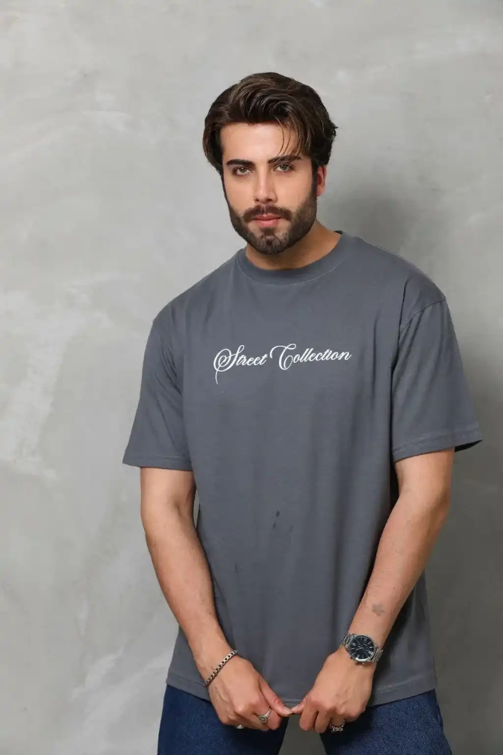 Unisex Bisiklet Yaka Baskılı Oversize T-Shirt - Füme