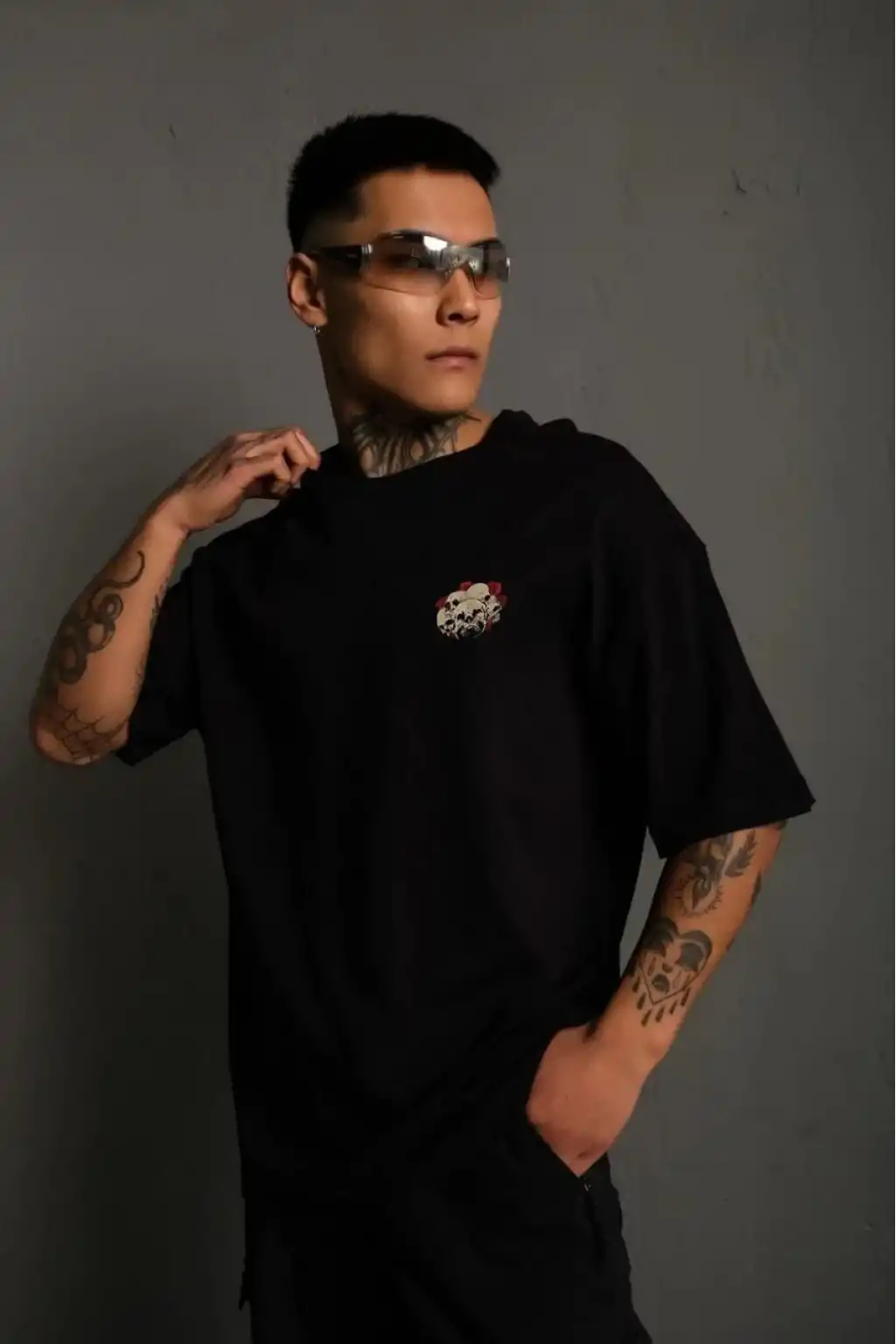 20/1 Penye Compack Vikings Valhalla Baskılı Oversize Bisiklet Yaka T-shirt - Siyah