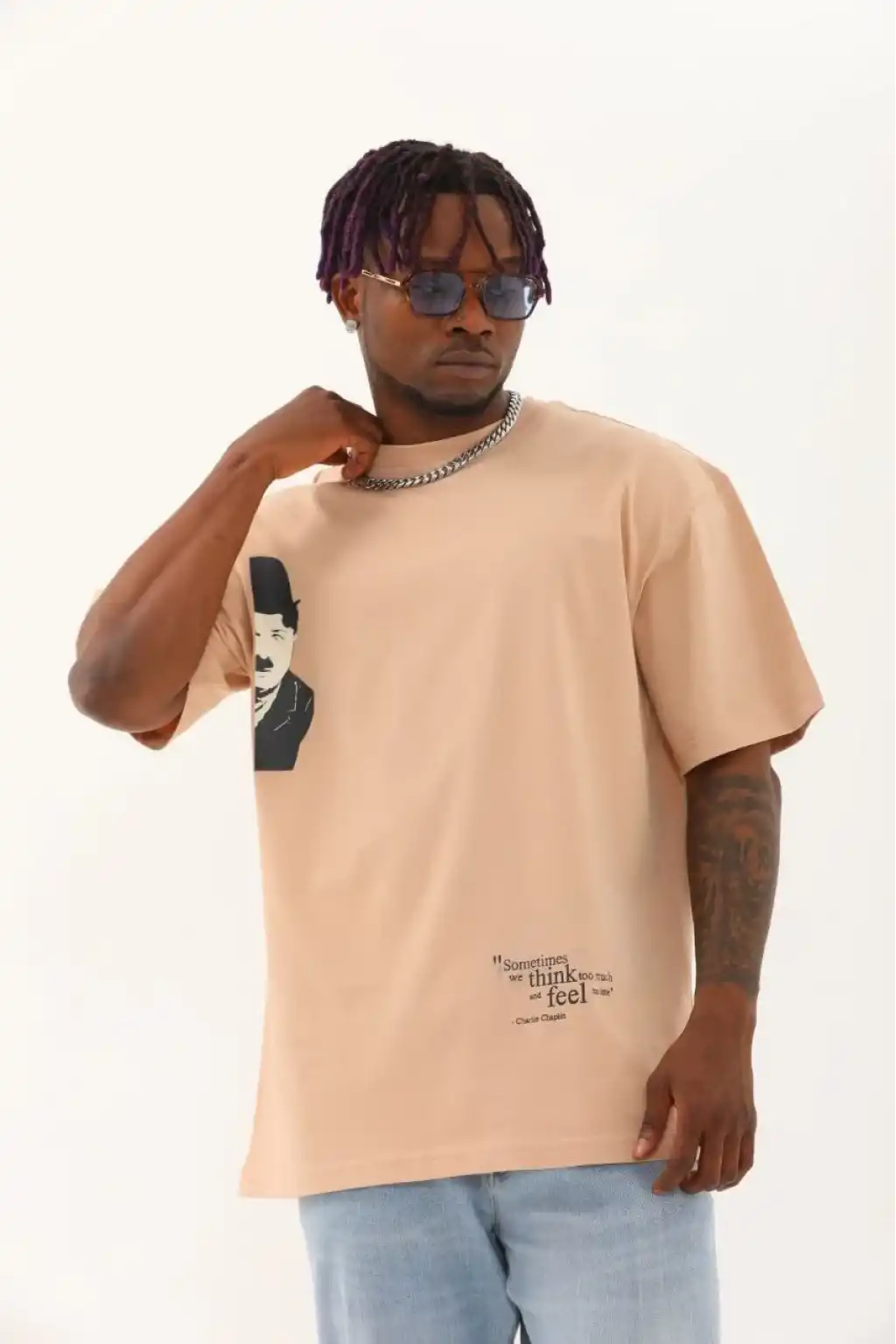 Unisex Oversize Baskılı Bisiklet Yaka T-Shirt - Bej