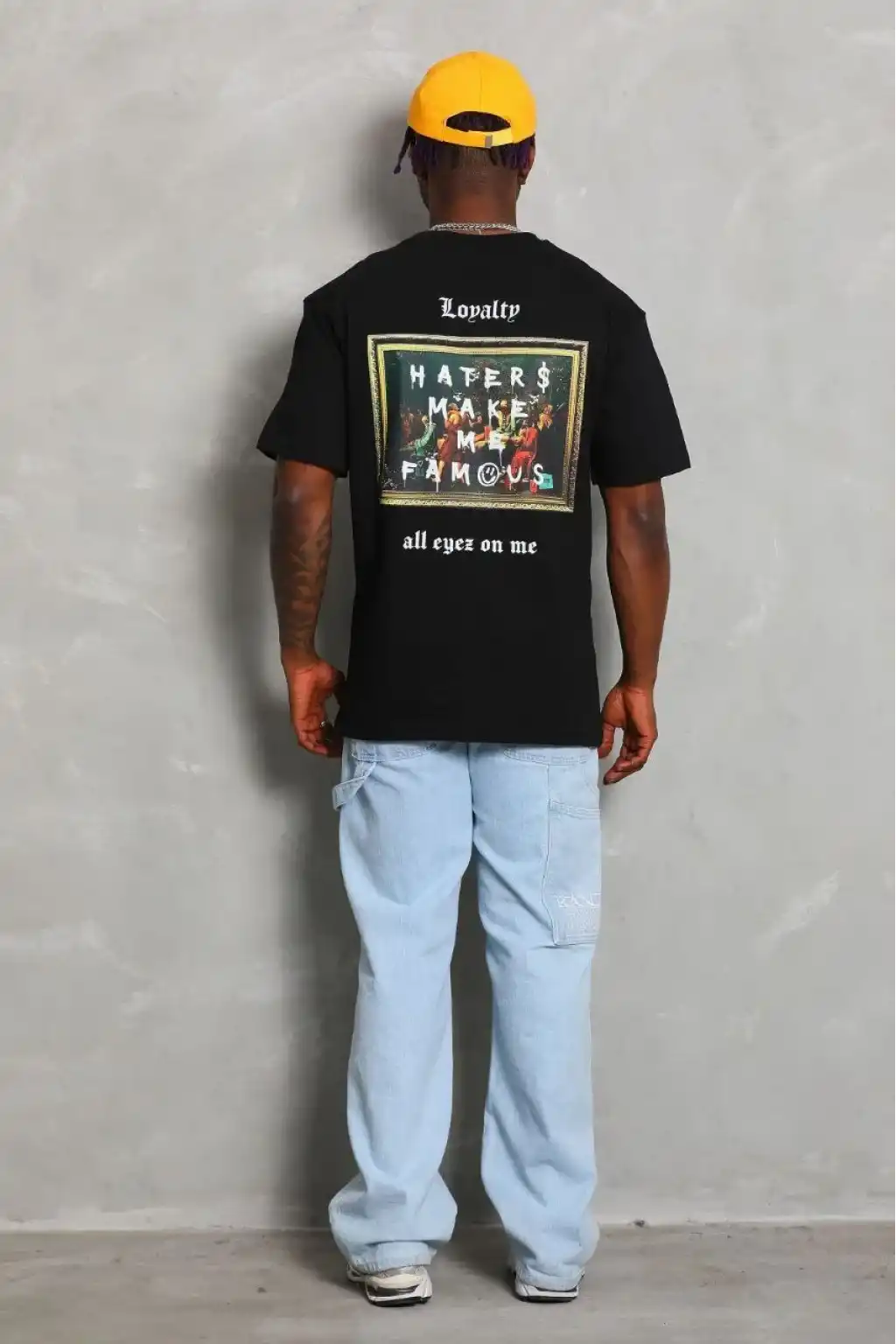 Unisex Oversize Baskılı Bisiklet Yaka T-Shirt - Siyah