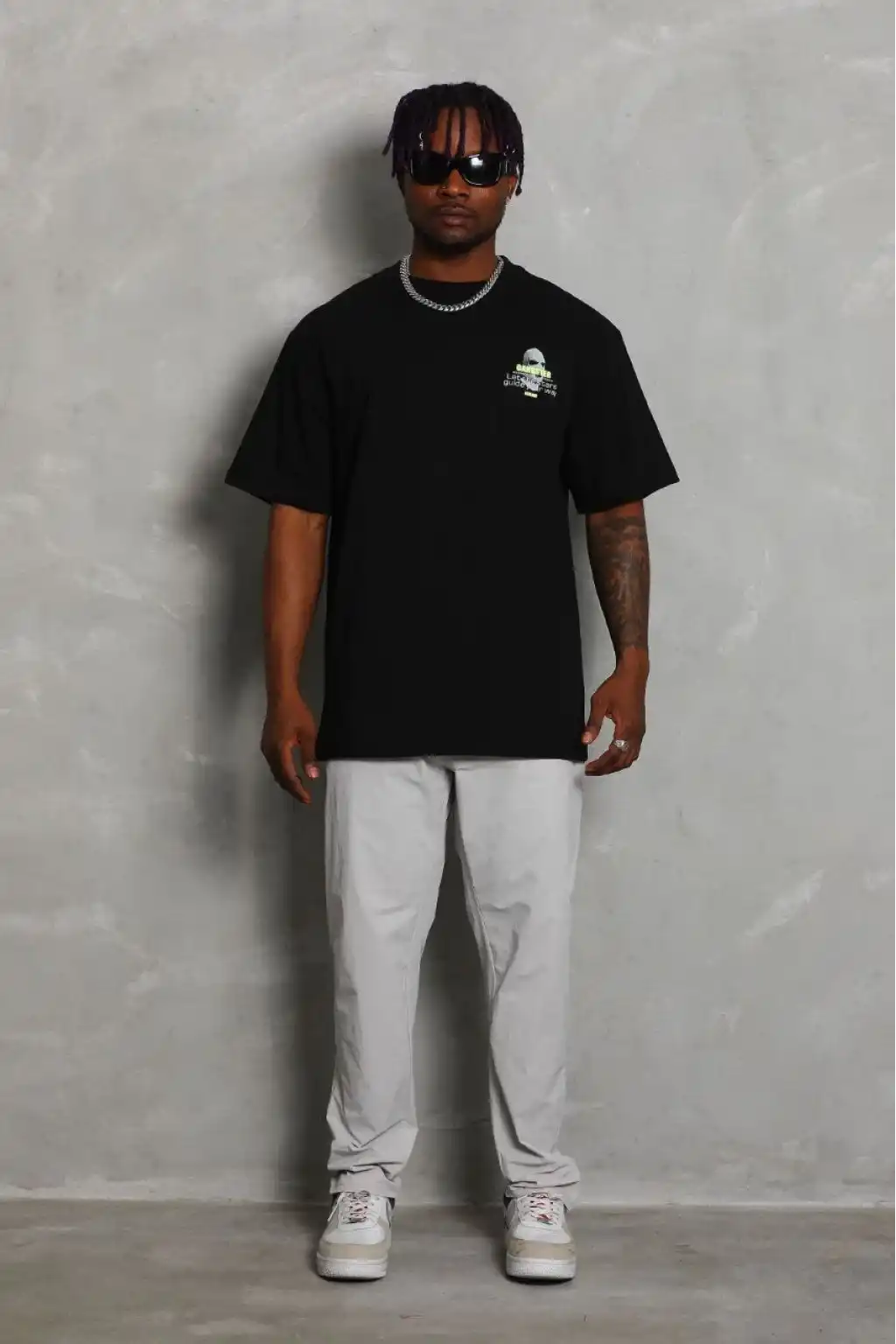 Unisex Oversize Baskılı Bisiklet Yaka T-Shirt - Siyah