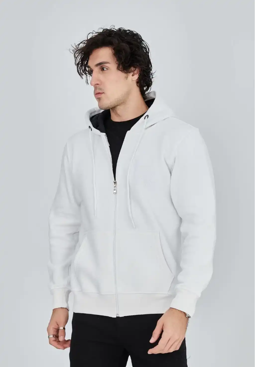 Unisex Tam Fermuarlı Kapşonlu SweatShirt - Beyaz