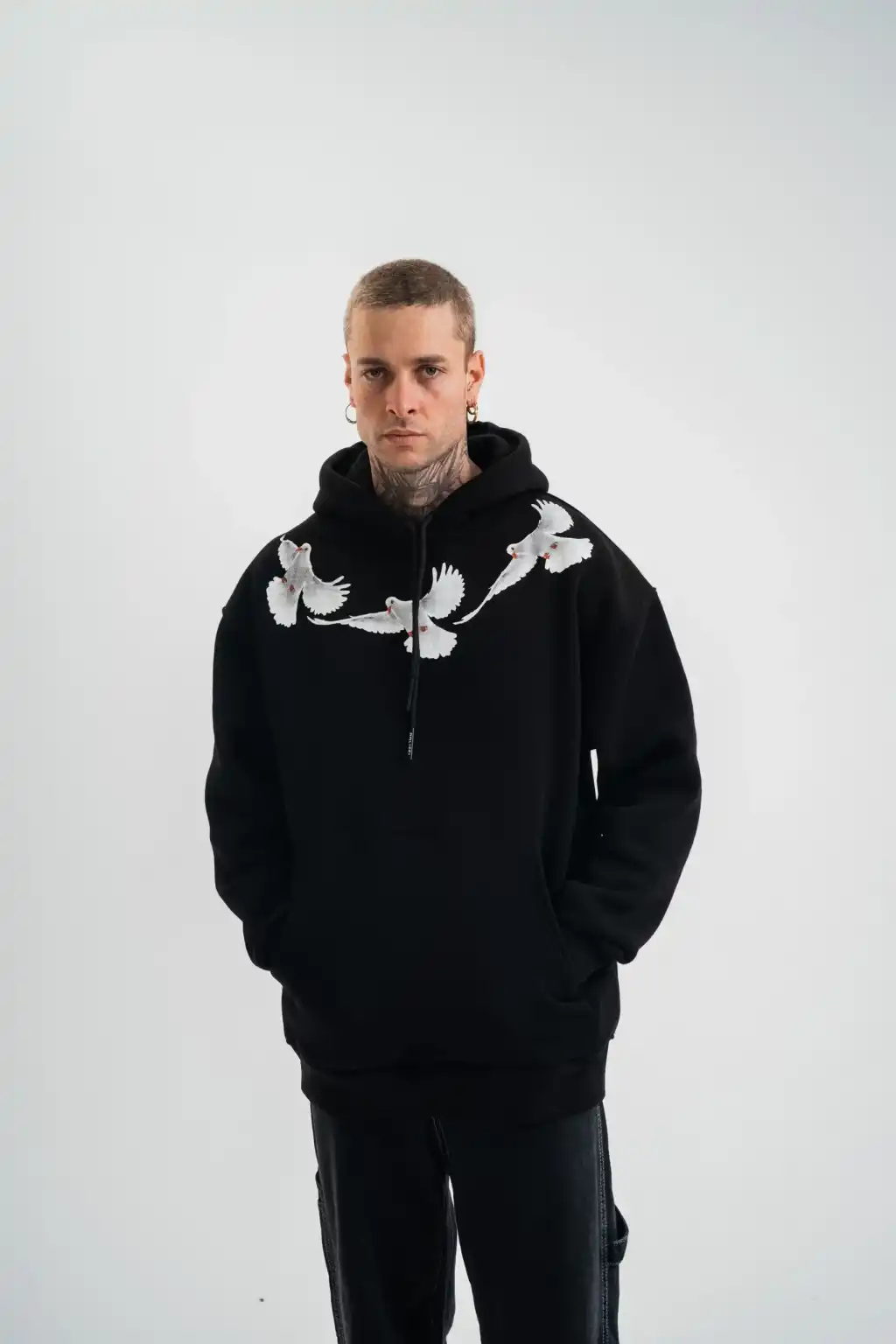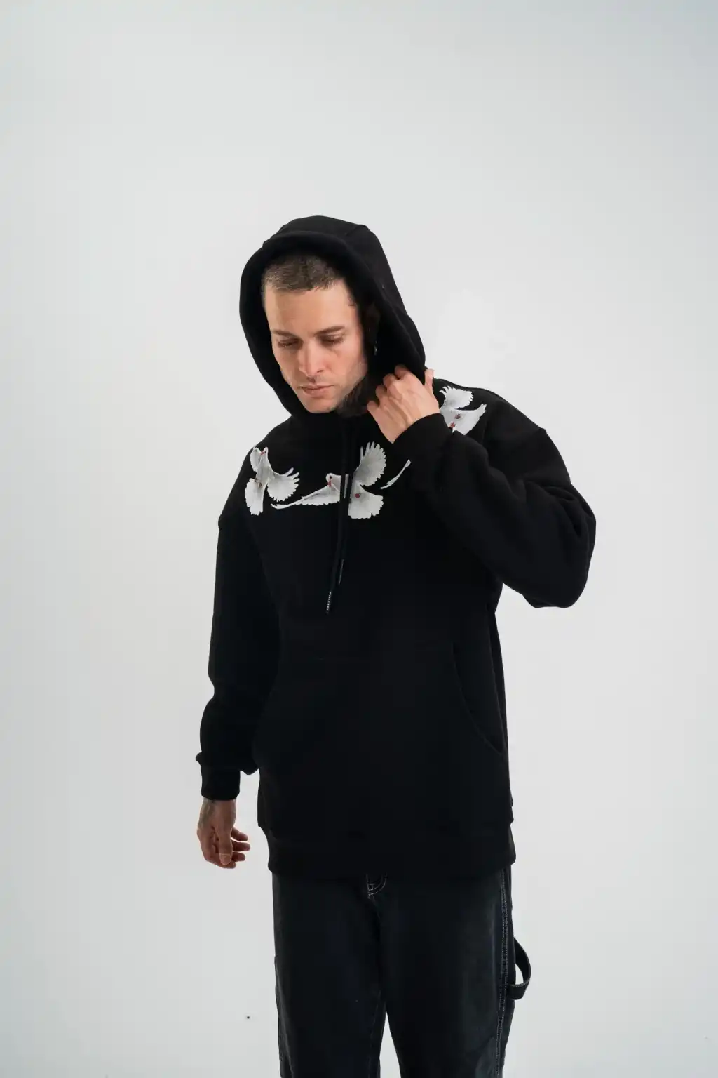 Erkek Premium Nakışlı Kapşonlu Sweatshirt Double Oversize Üç İplik Pamuklu - Siyah