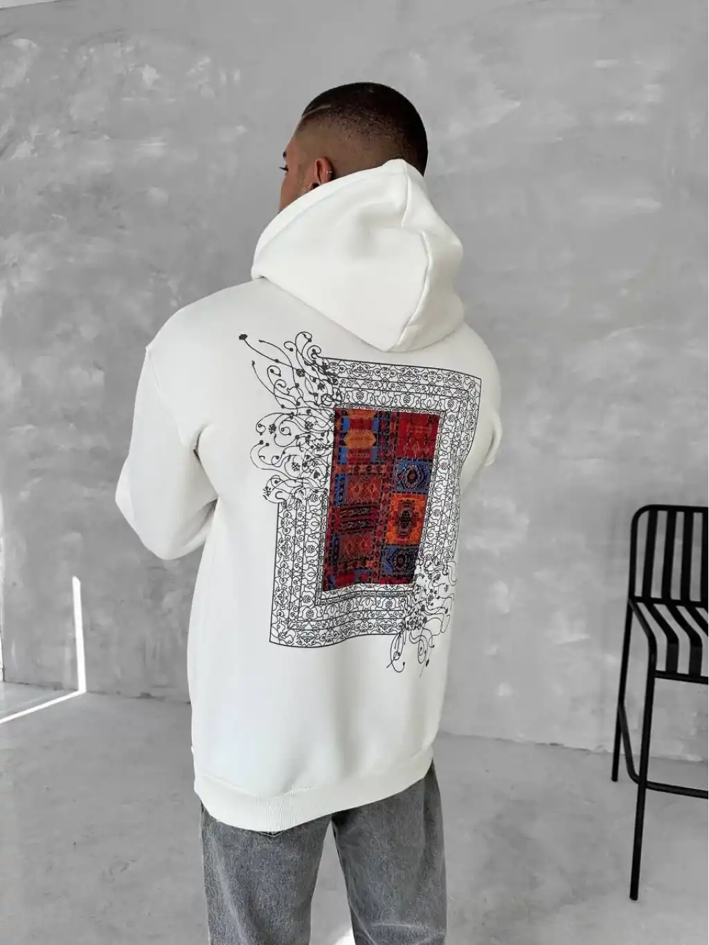 Erkek Oversize Kapüşonlu Sweatshirt – Beyaz Renk Üç İplik İçi Pamuklu Kanguru Cepli Baskılı Hoodie Rahat Kalıp Kışlık Günlük Kombinlere Uygun - Beyaz