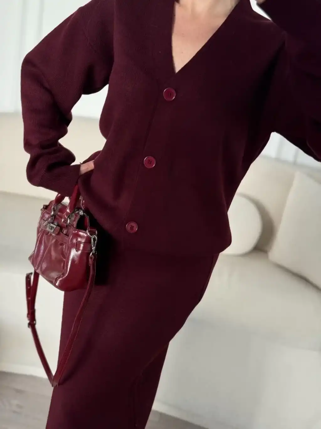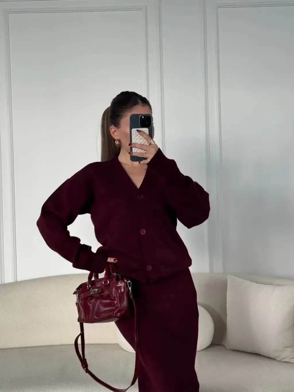 V Yaka 3 Düğmeli Hırka Takım Triko İkili Etekli - Bordo