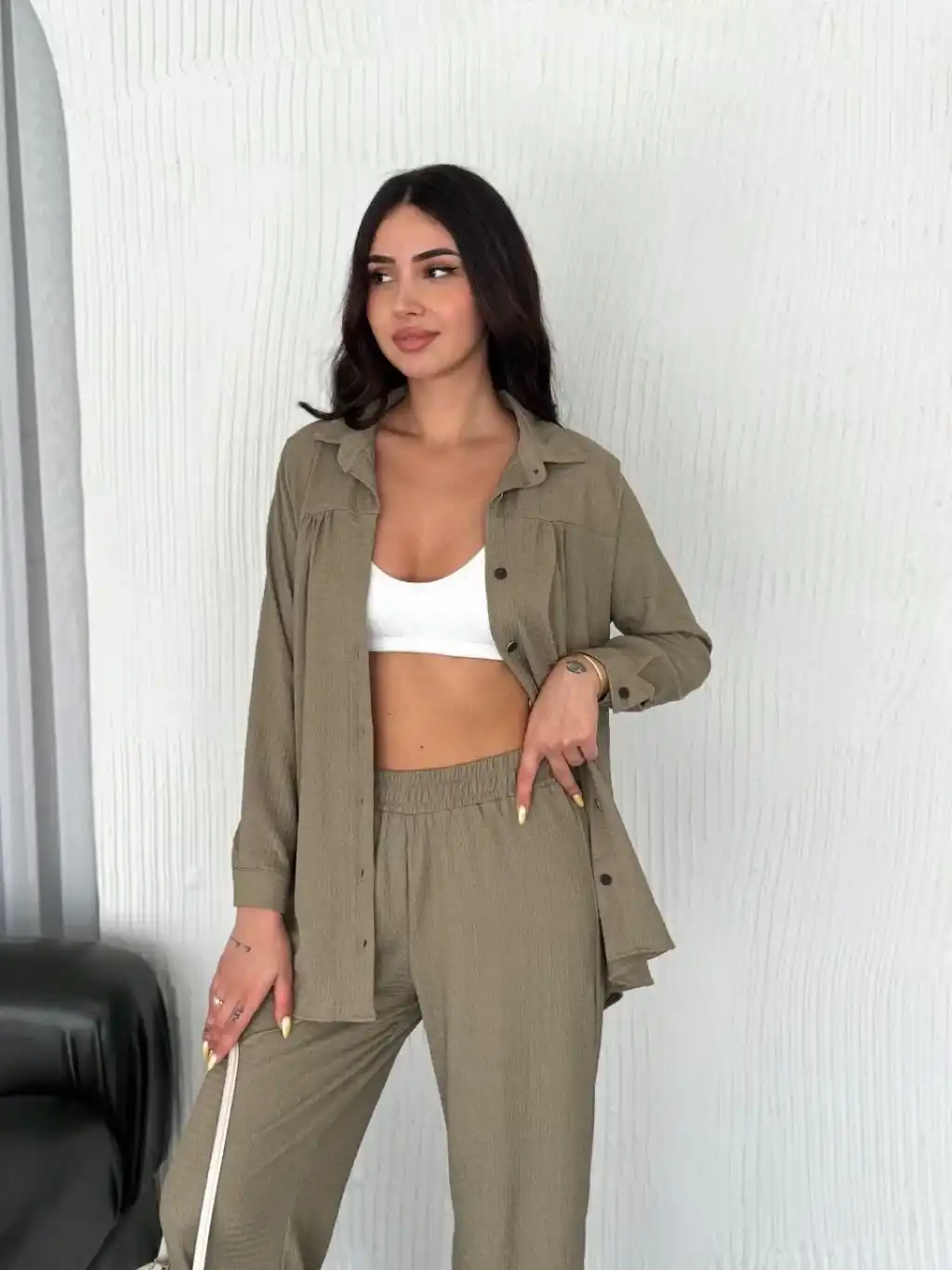 Yakalı Düğmeli Uzun Kollu Gömlek Pantolon ikili Takım - Bej
