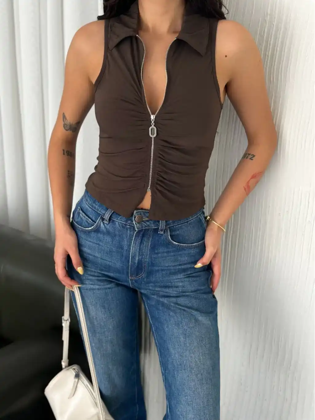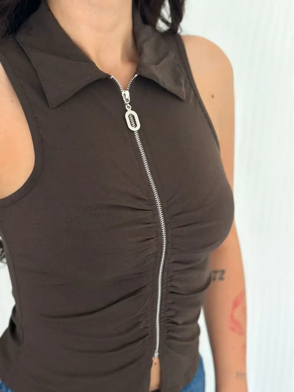 Yakalı Tam Fermuarlı Kolsuz Bluz - Kahverengi