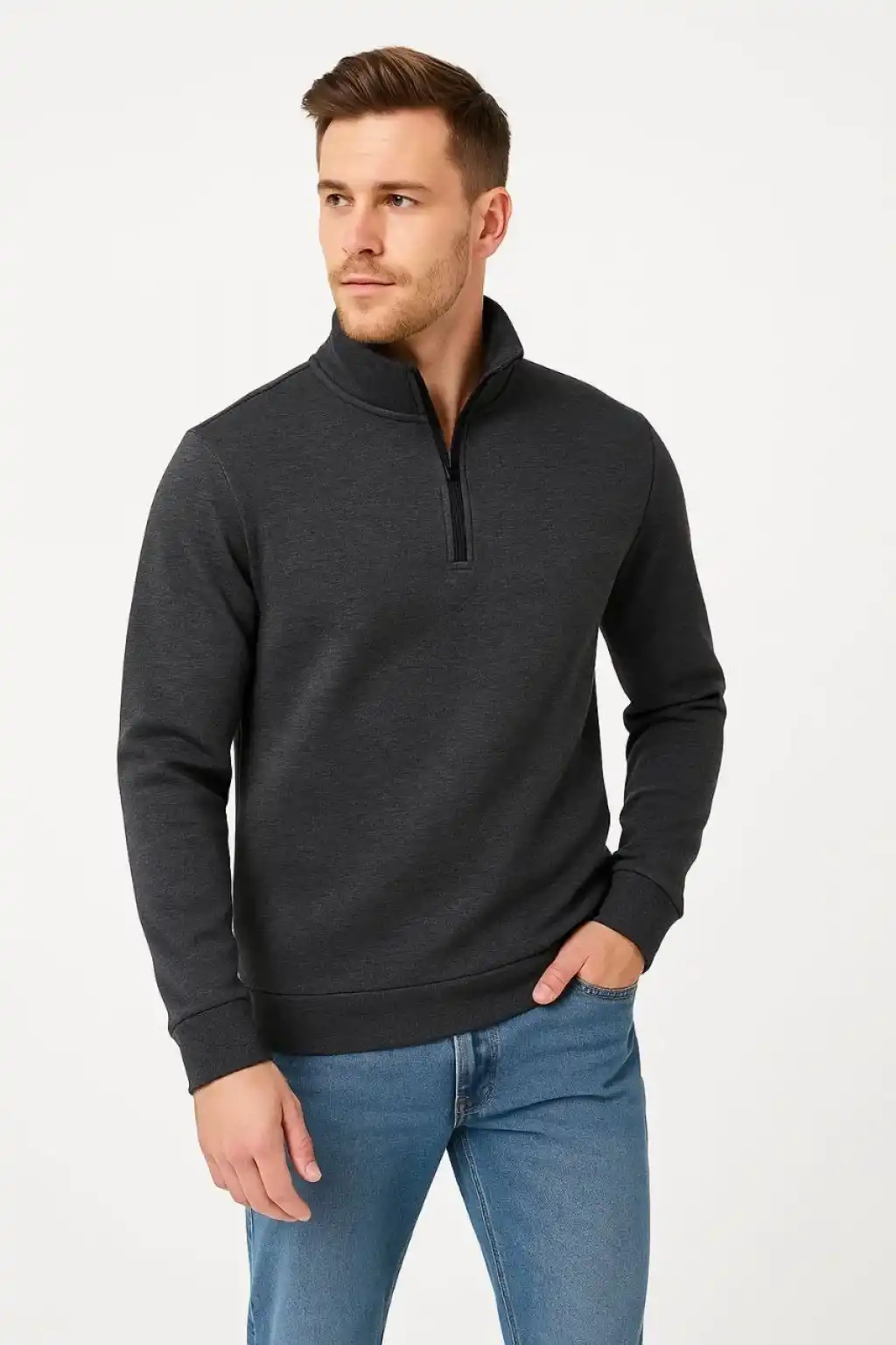 Erkek Dik Yaka Sweatshirt Dik Yaka Yarım Fermuarlı 3 İplik Şardonlu Pamuk Kumaş - Antrasit