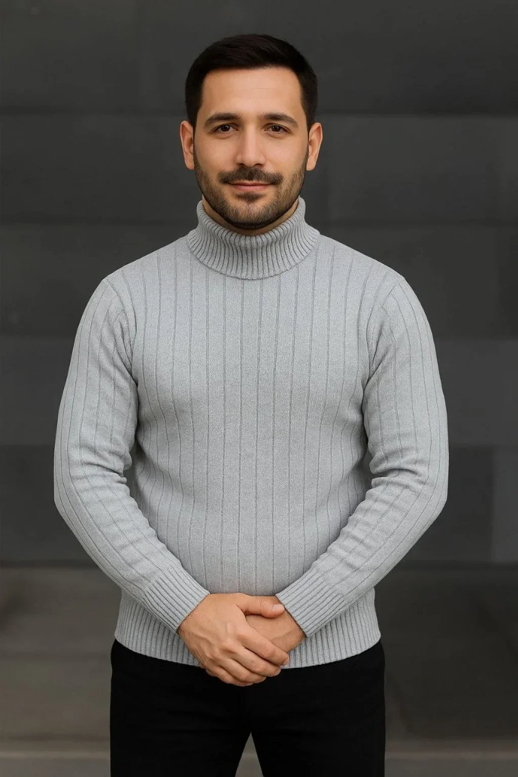 • Erkek Fitilli Triko Kazak 2'li Set Gri Siyah Regular Balıkcı Yaka Tam Boğazlı Triko Seti Modeli Kazak