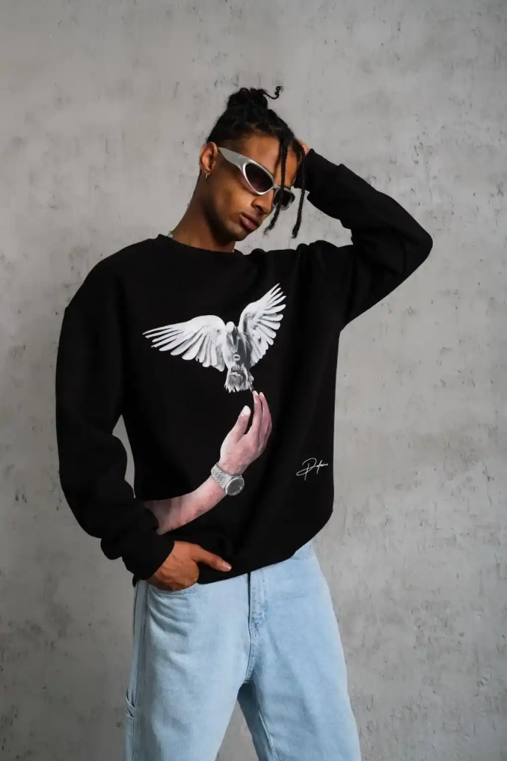 Erkek Güvercin Baskılı Sweatshirt - Siyah