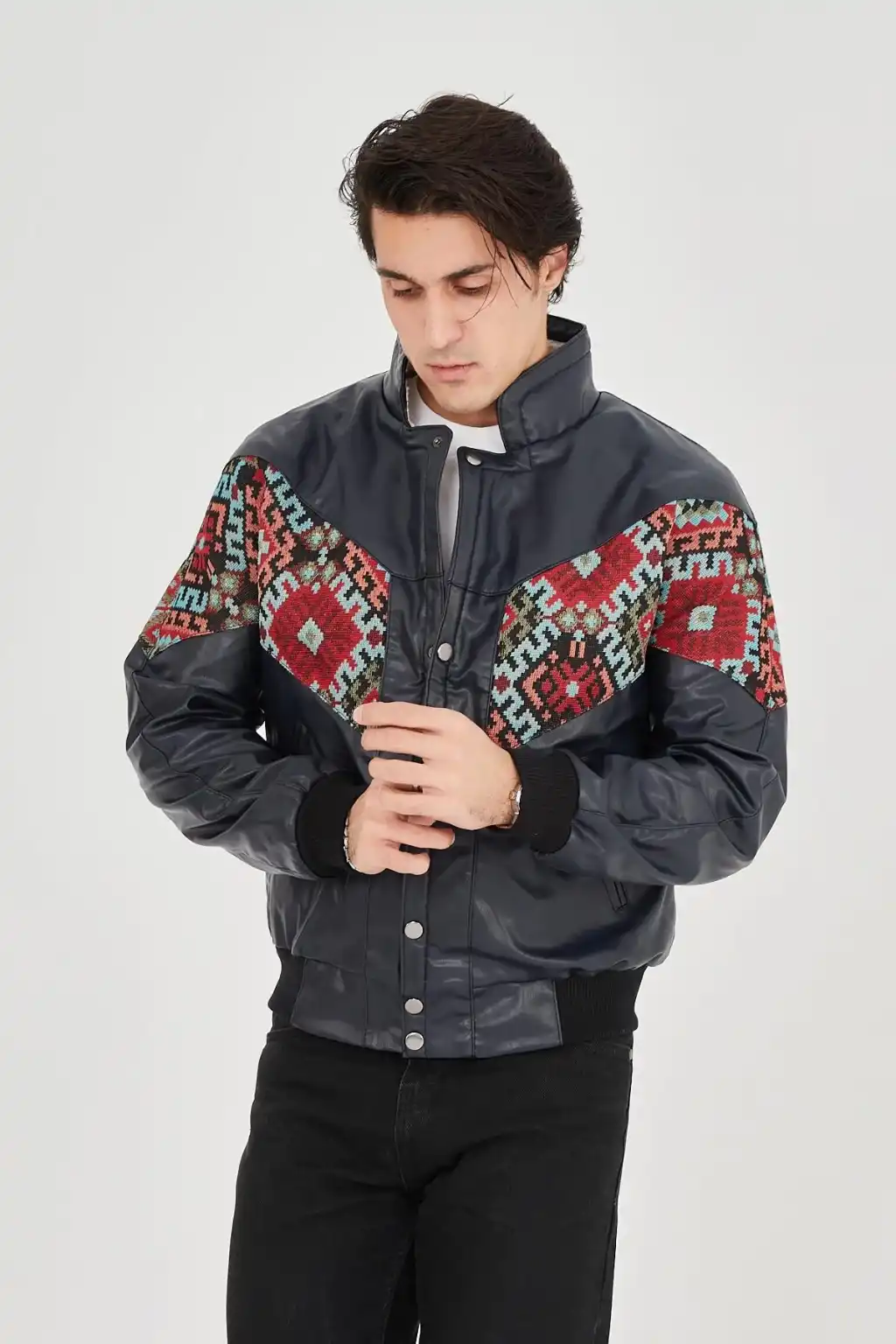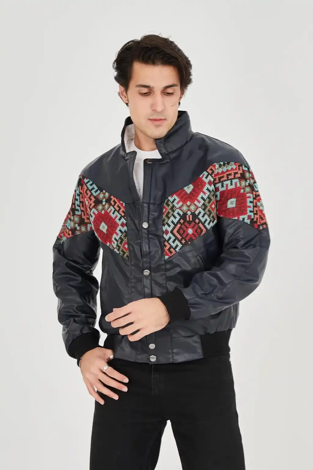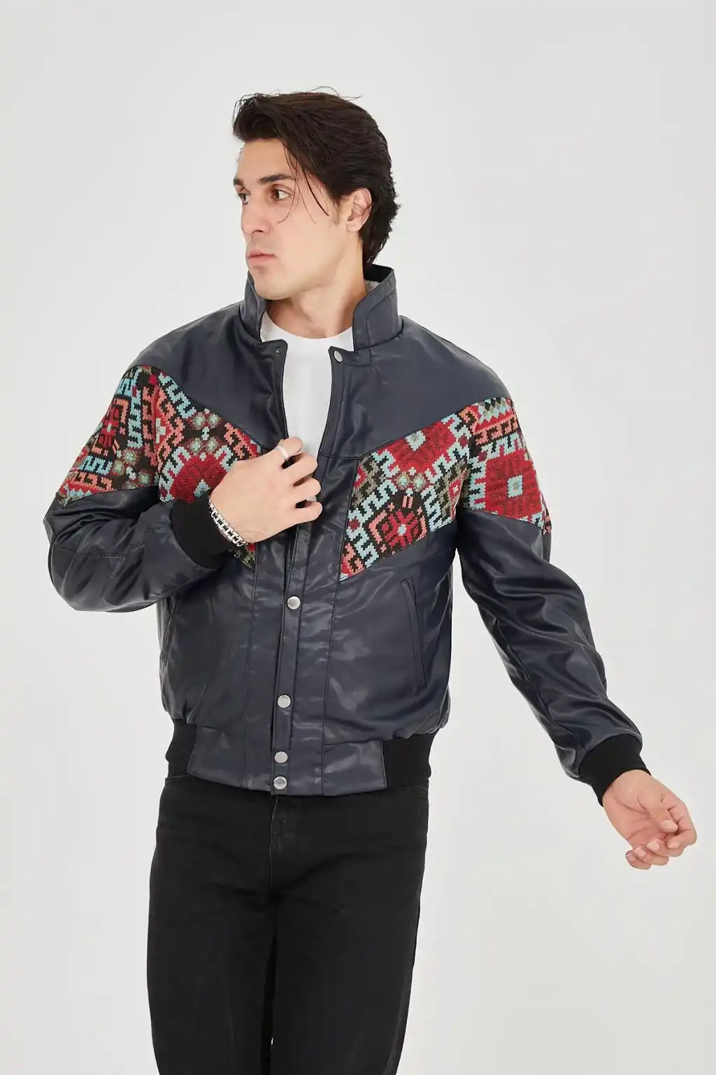 Erkek İçi Astarlı İçten Yaka Kısmı Peluşlu Suni Kumaş Vintage Ceket - Lacivert