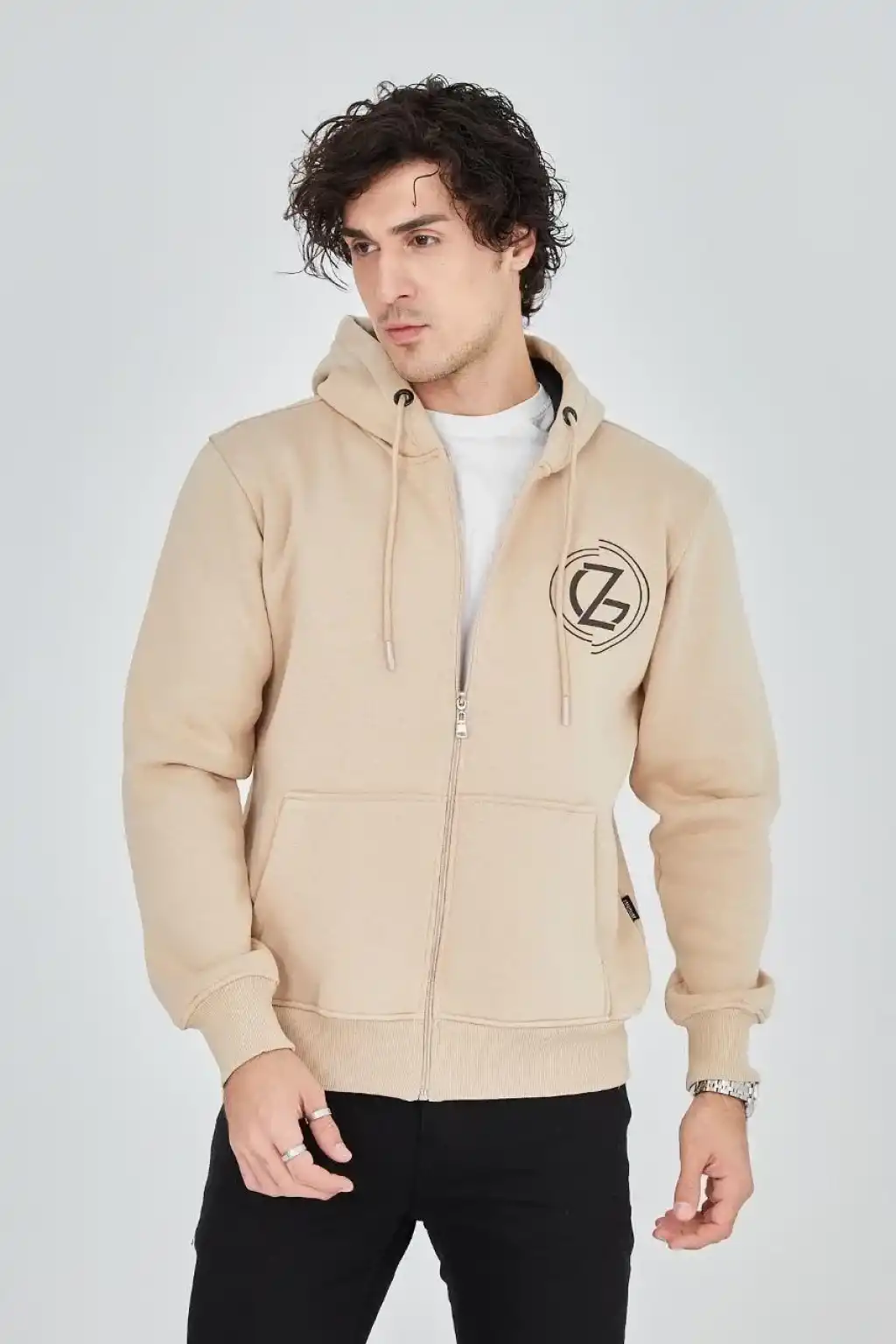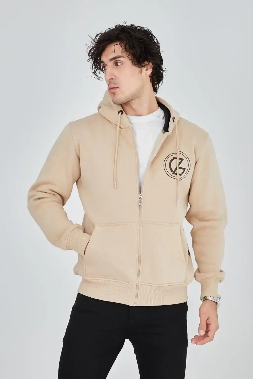 Erkek Kapüşonlu Baskılı Fermuarlı Hırka - Bej