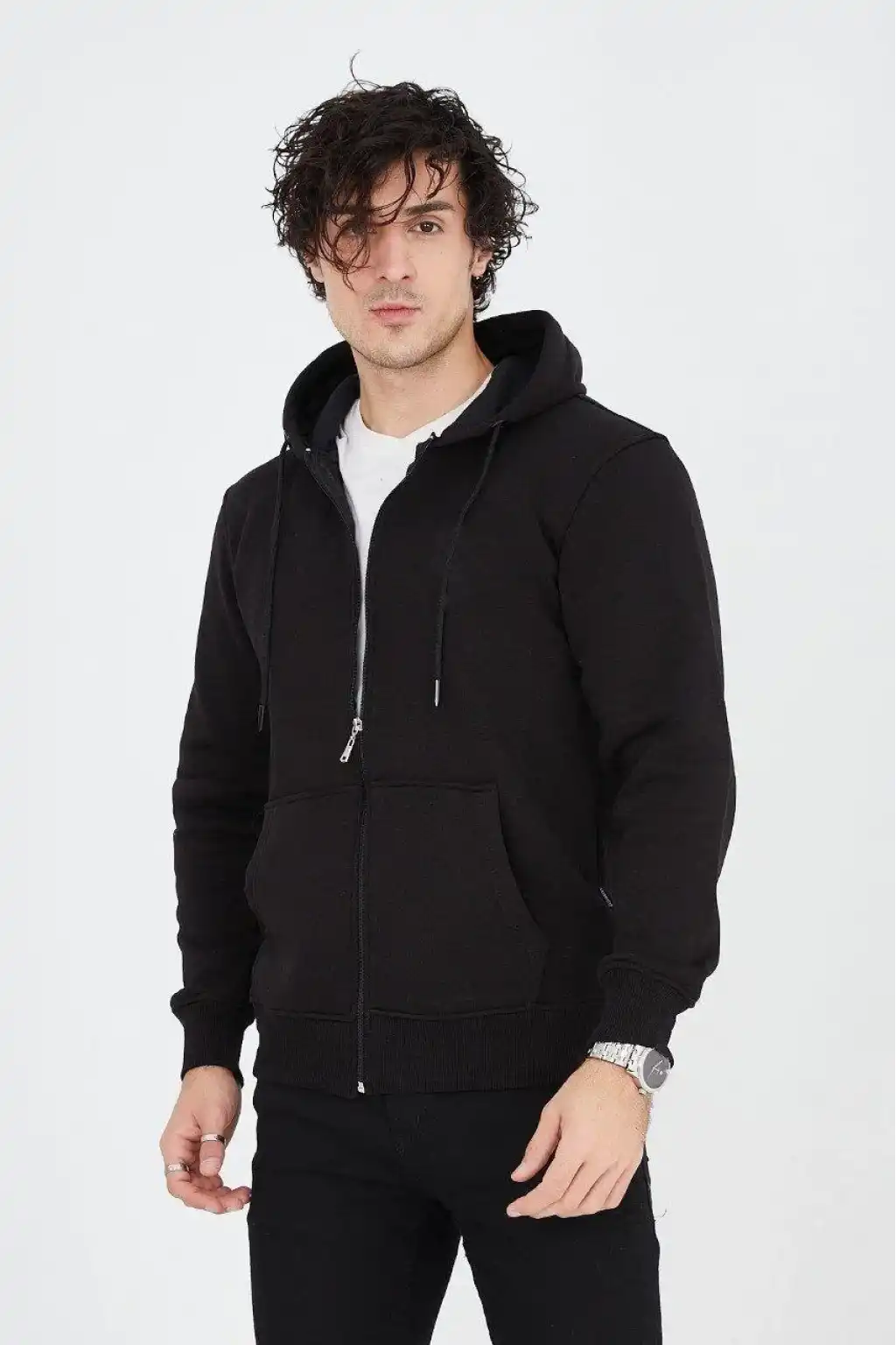 Erkek Kapüşonlu Düz Fermuarlı Hırka - Siyah
