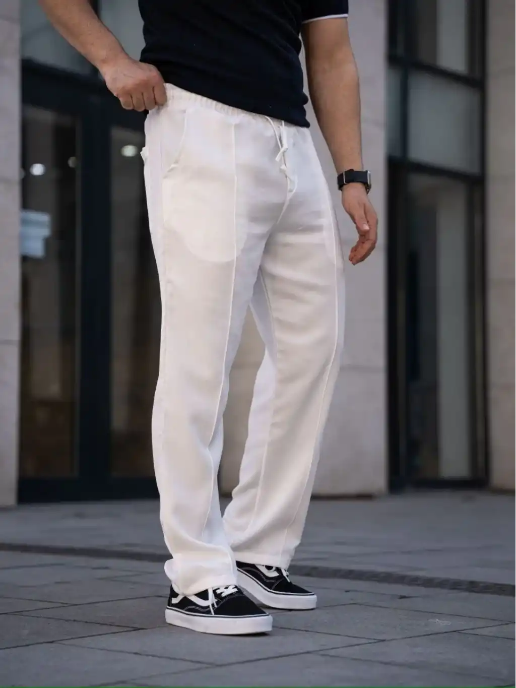 Erkek Keten Pantolon – Cepli, Beli Lastikli ve Bağcıklı, Nefes Alan Rahat Kalıp, Yazlık ve Baharlık Günlük Giyim, Şık & Konforlu Boru Paça Model - Beyaz