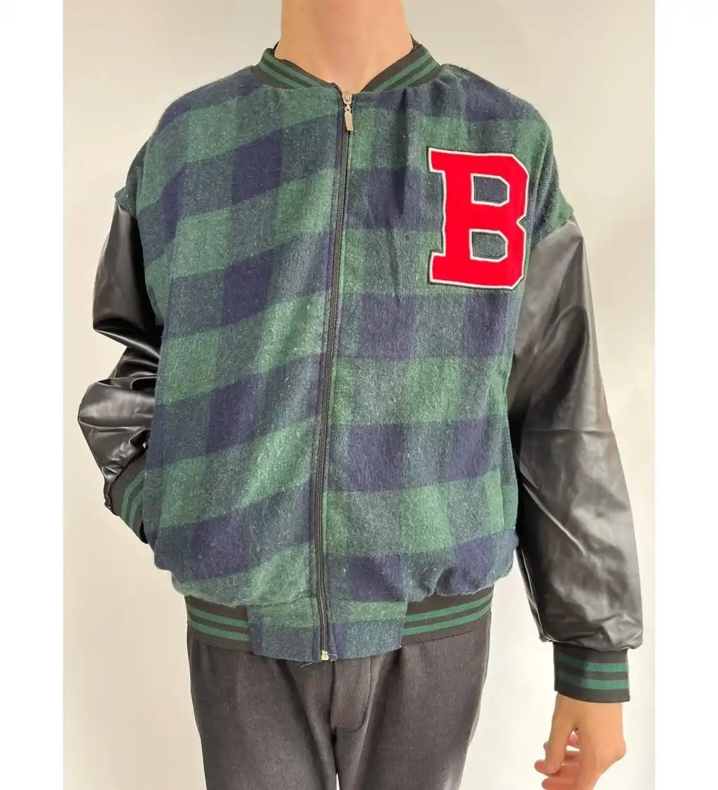Erkek Kolej Ceket – Kareli Oduncu Kumaş, Kolları Suni Deri, Fermuarlı, İçi Kapitone Astarlı, Nakışlı Oversize Bahar & Kış Stil - Bordo