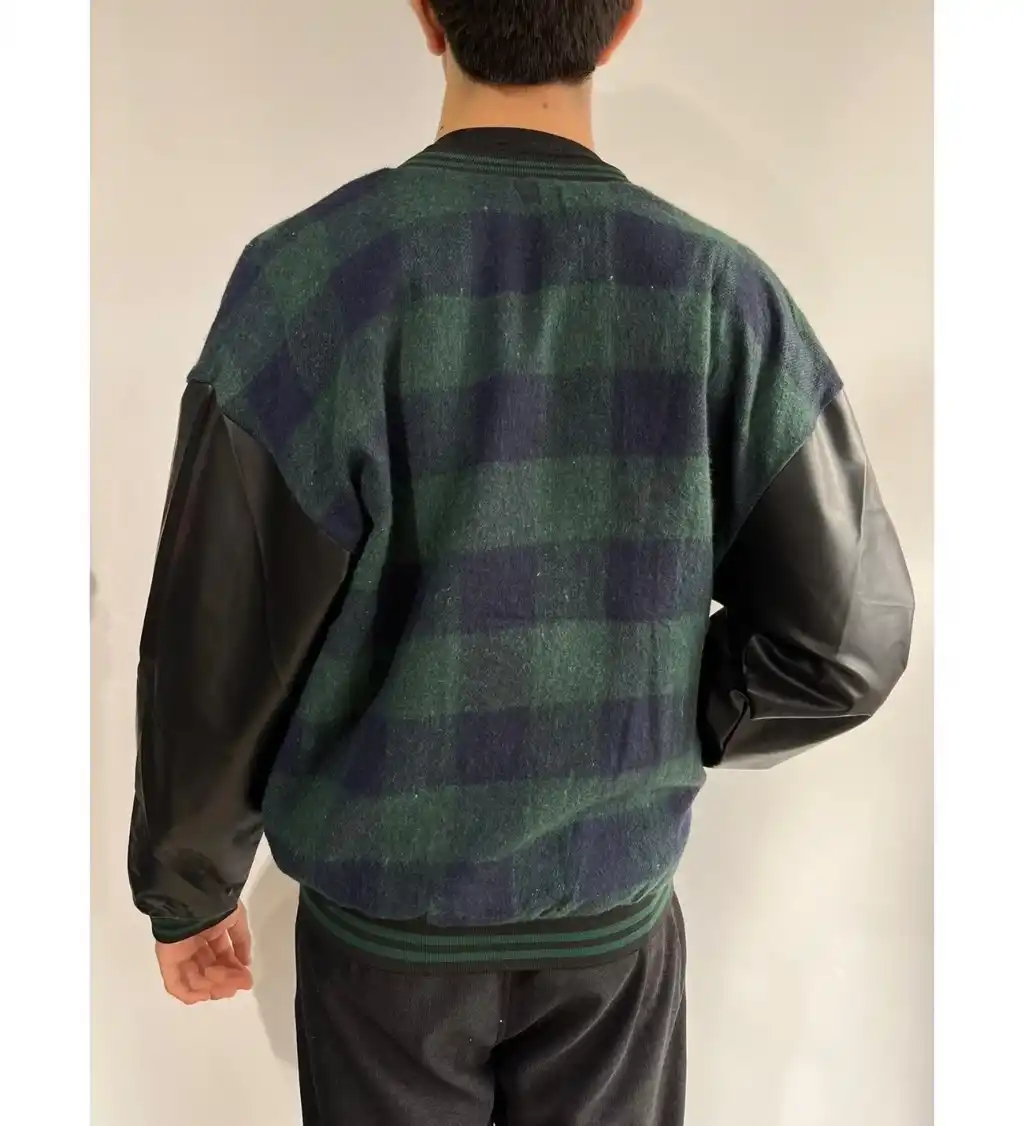 Erkek Kolej Ceket – Kareli Oduncu Kumaş, Kolları Suni Deri, Fermuarlı, İçi Kapitone Astarlı, Nakışlı Oversize Bahar & Kış Stil - Haki