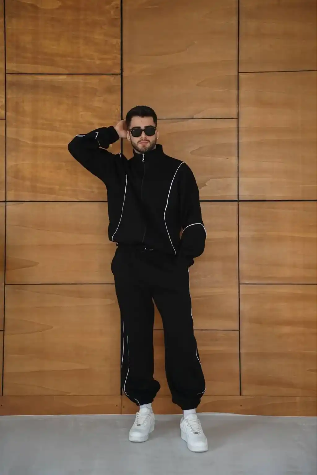 Erkek Çift Şeritli Eşofman Takım Dik Yaka Fermuarlı Sweatshirt Boru Paça Alt, Oversize 3 iplik Pamuklu - Siyah