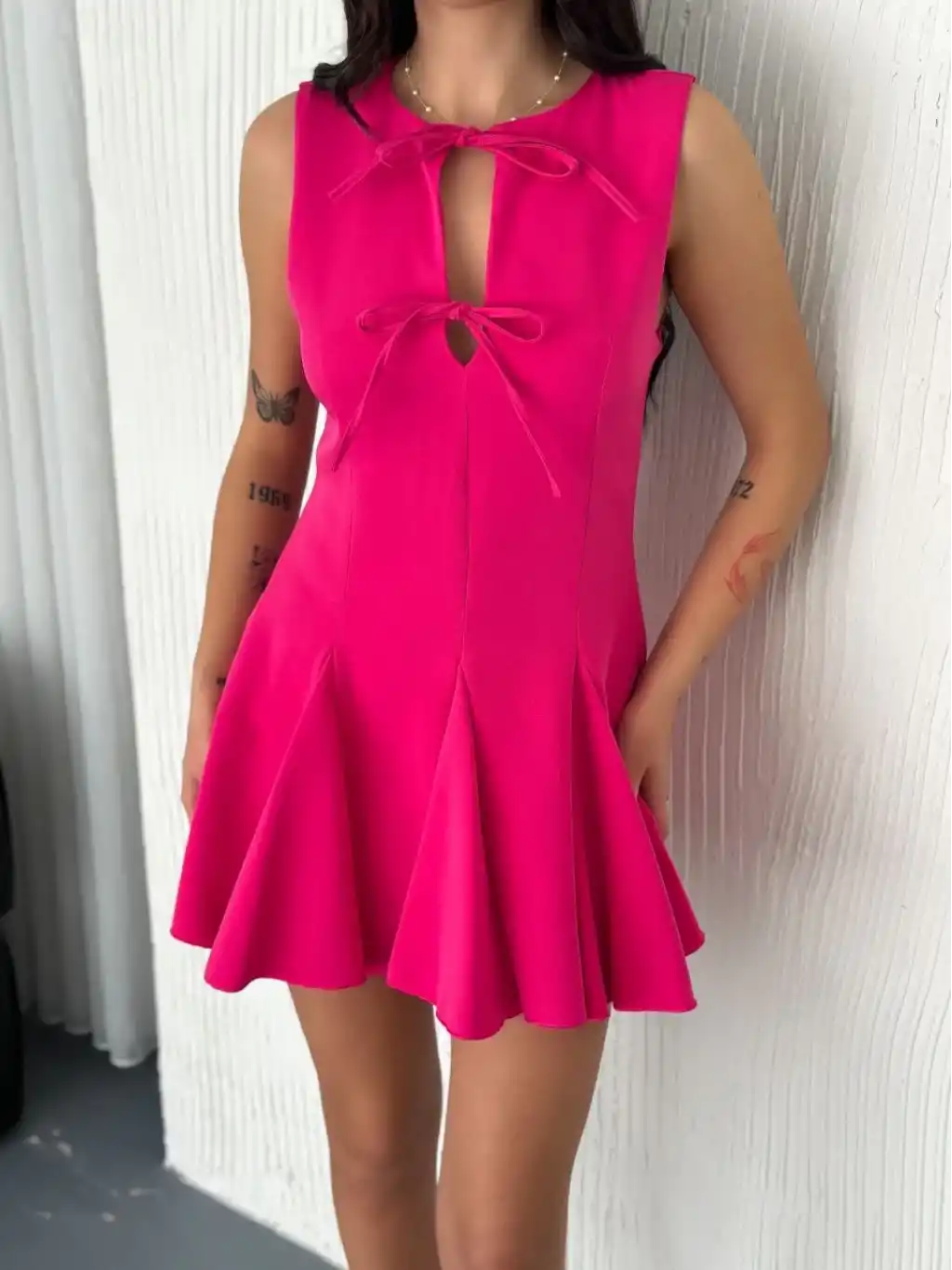 Göğüs Bağlamalı Kolsuz Mini Boy Elbise - Pembe
