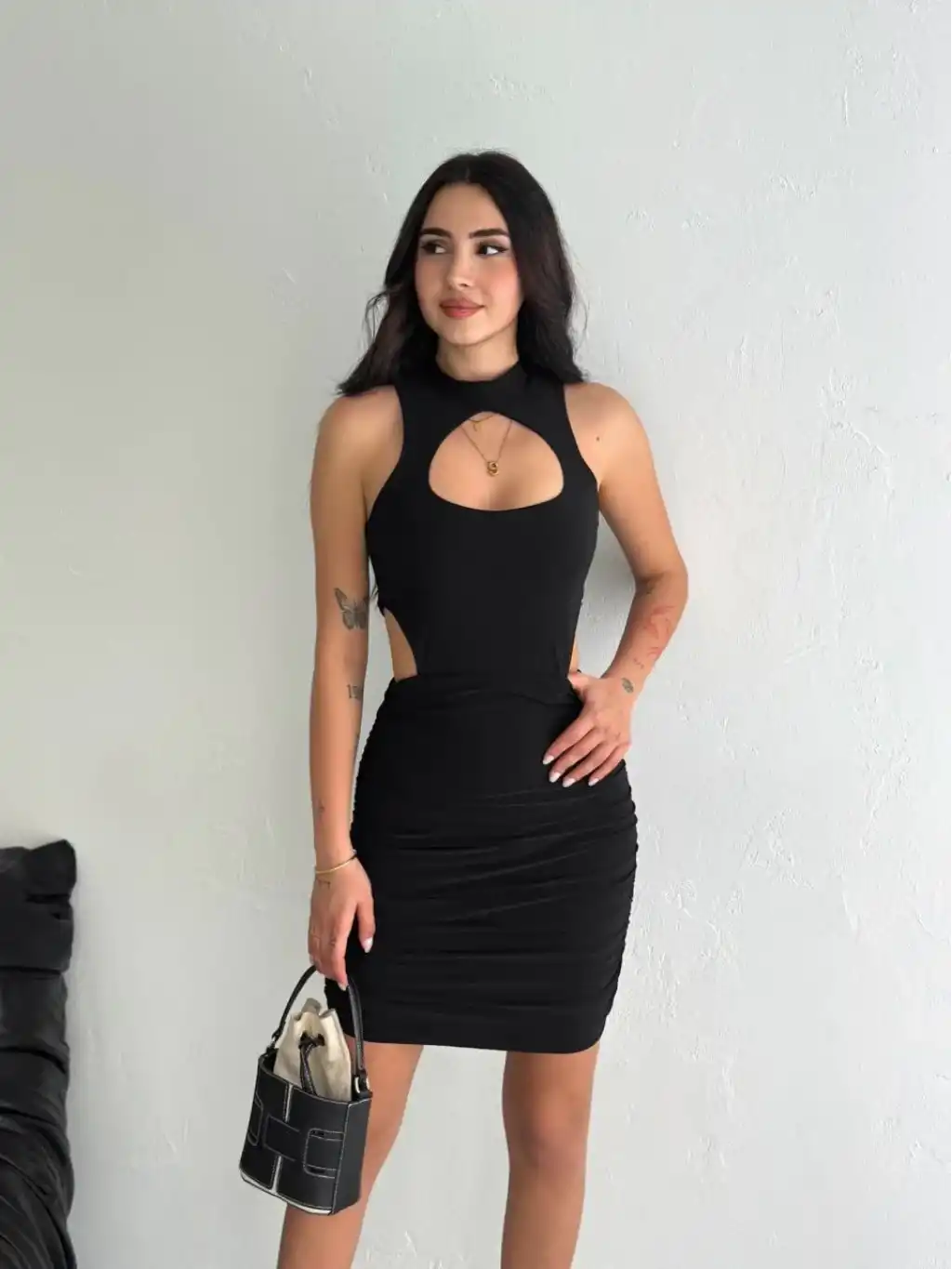 Göğüs ve Yanlar dekolteli Kolsuz Boy Elbise - Siyah
