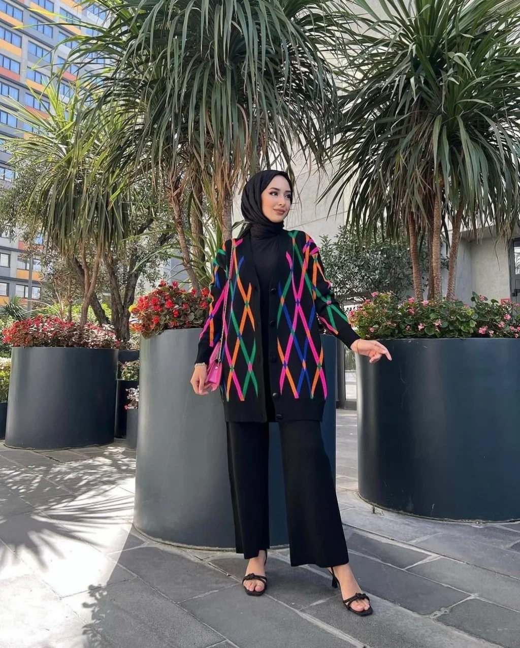 Uzun hırka içi elbise ikili triko takım ekose baklava desen haki kırmızı