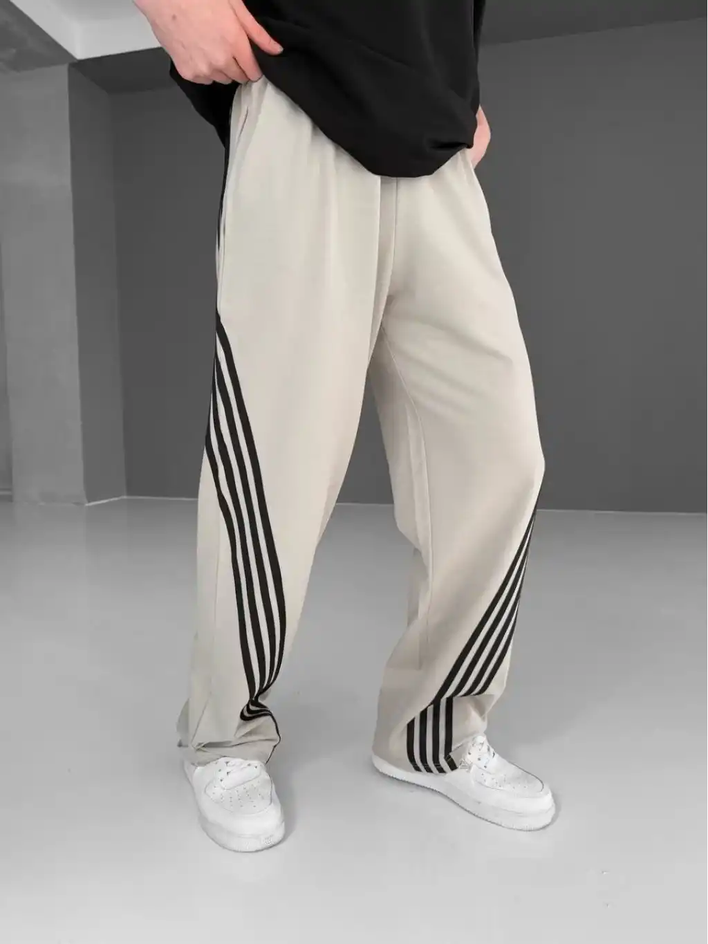 Erkek Üç İplik Kışlık Pamuklu Yandan Garneli Kalın Şeritli Cepli Eşofman Altı - Bej