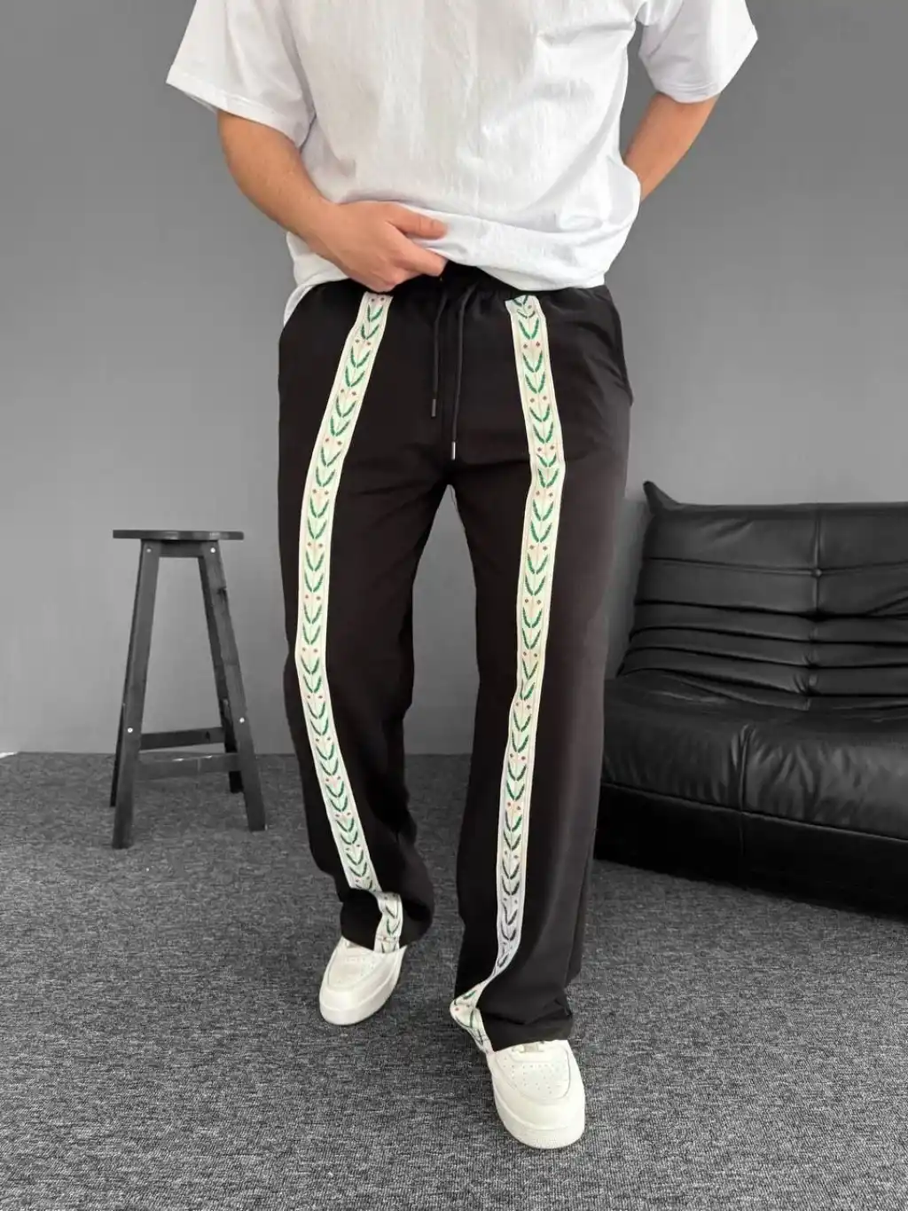 Erkek Yandan Şeritli Boru Paça Eşofman Altı 3 iplik Pamuklu Eşofman - Siyah