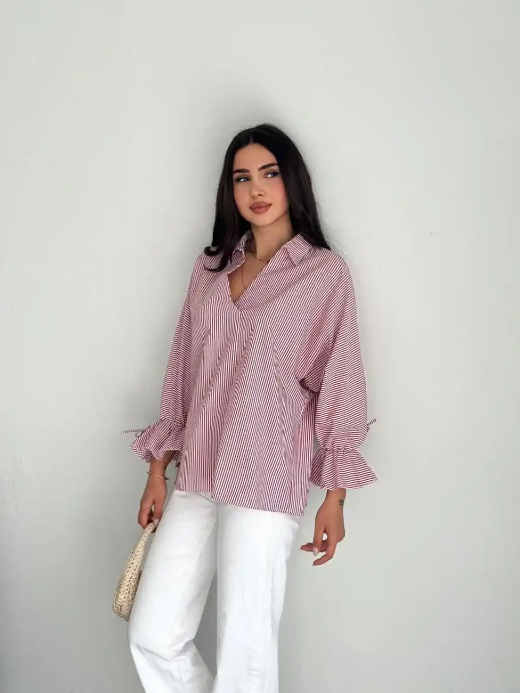 Kadın Arkası Asimetrik Yırtmaç Kesim Detaylı Cizgili Bluz Gömlek - Bordo