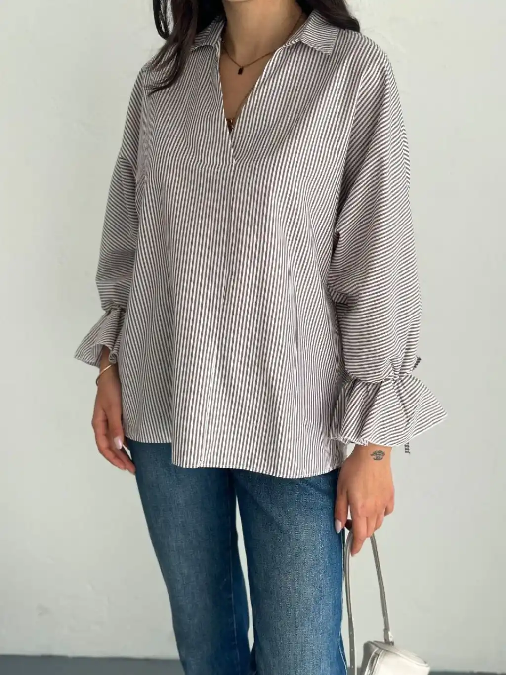 Kadın Arkası Asimetrik Yırtmaç Kesim Detaylı Cizgili Bluz Gömlek - Gri