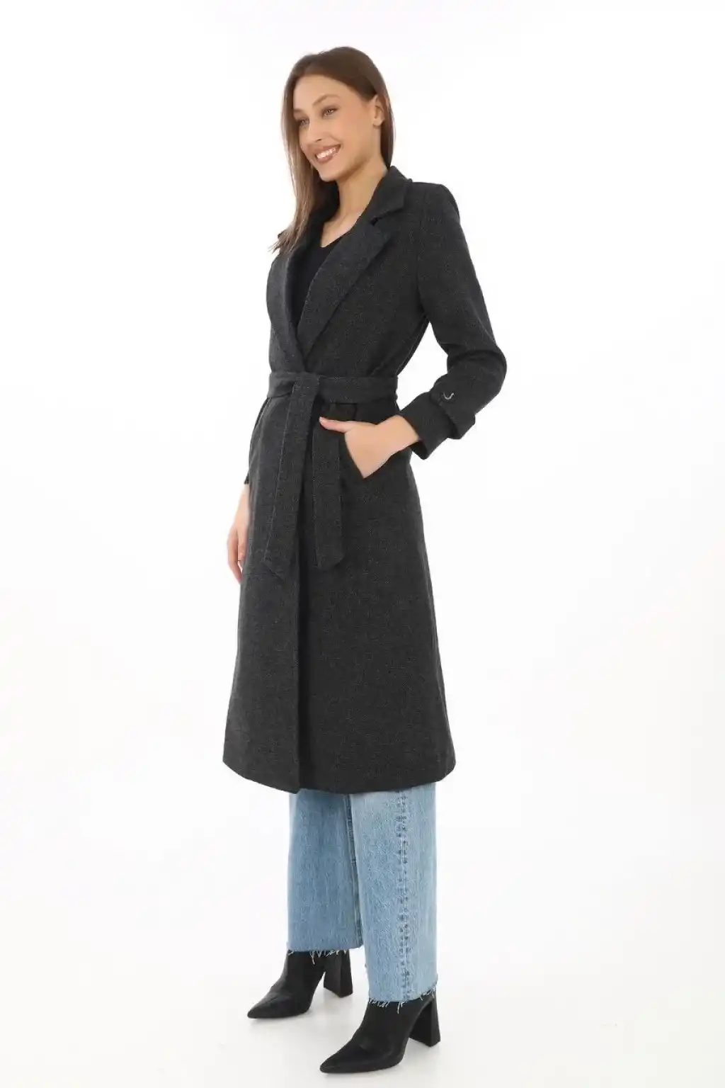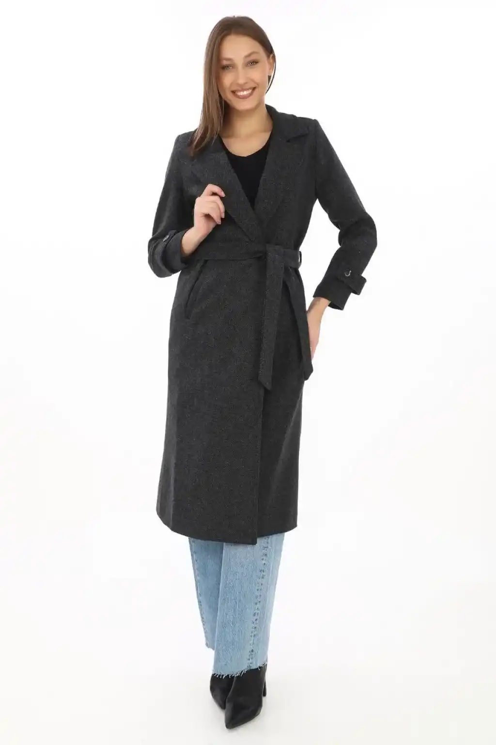 Kadın Astarlı Balık Sırtı Kaşmir Kaşe Kaban - Siyah