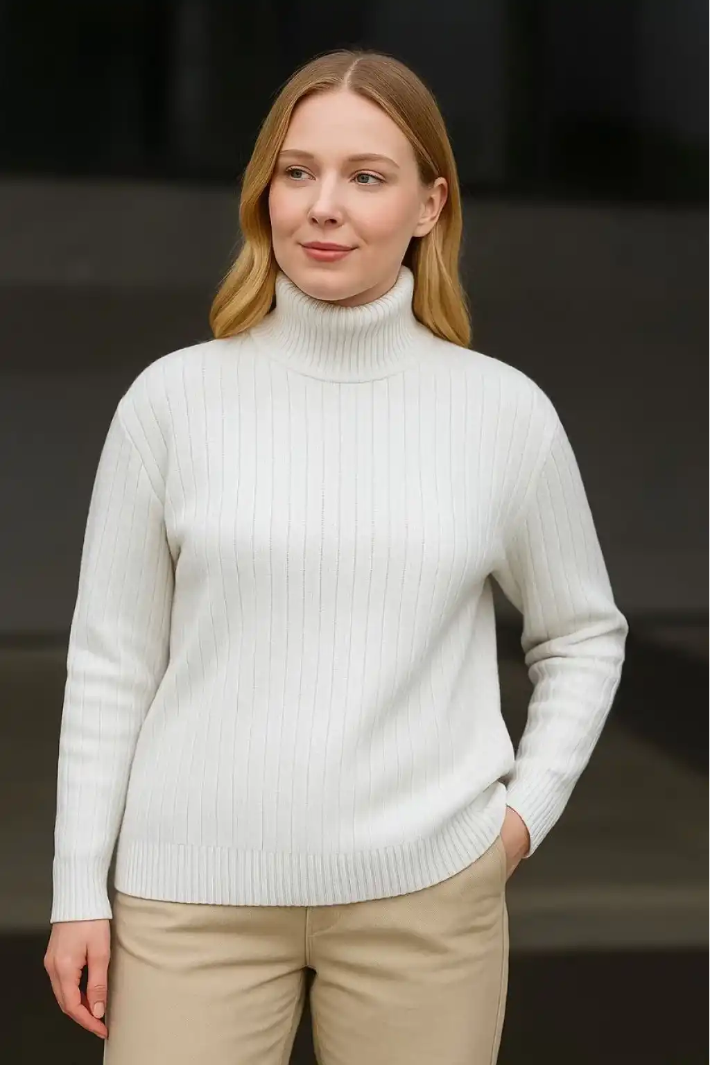 Kadın Yarım Boğaz Triko Kazak yumuşak dokulu Pamuklu ince Dokuma, uzun kollu Rahat Regular kalıp - Bej
