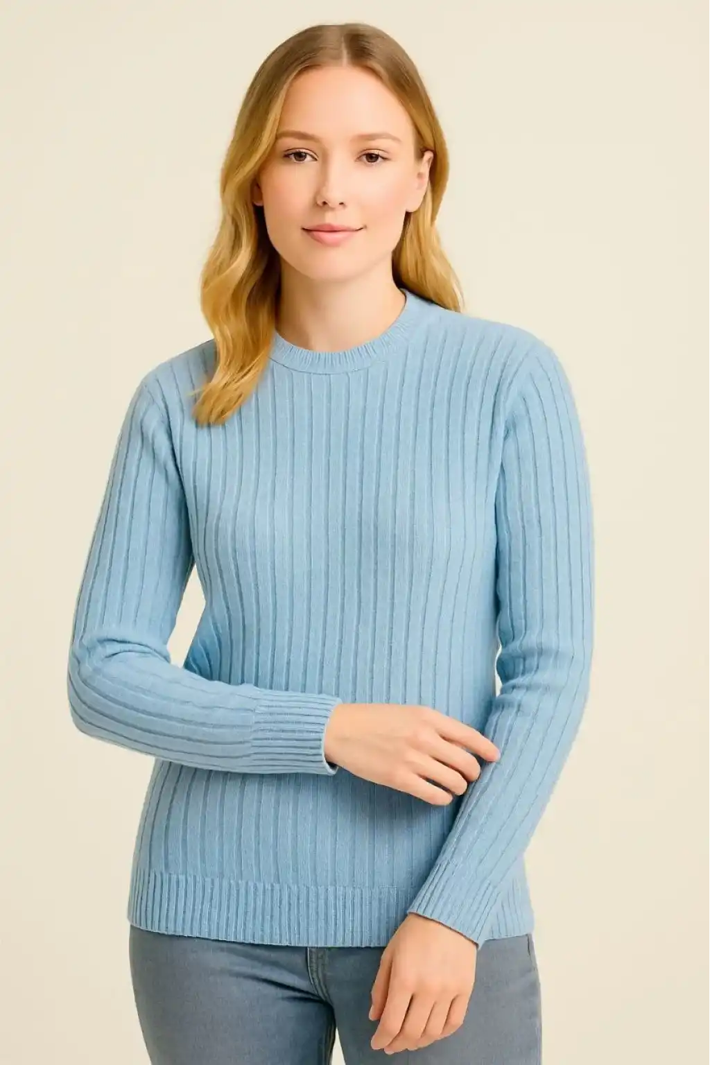 Kadın Bisiklet Yuvarlak Yaka Triko Kazak Pamuklu Kalın Fitilli Dokuma, Regular Fit Uzun Kollu Kışlık Model - Bebe Mavisi
