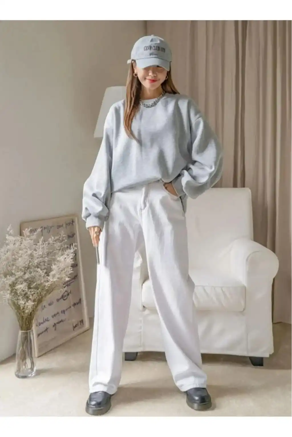Kadın Üç İplik Düz Bisiklet Yaka SweatShirt - Beyaz