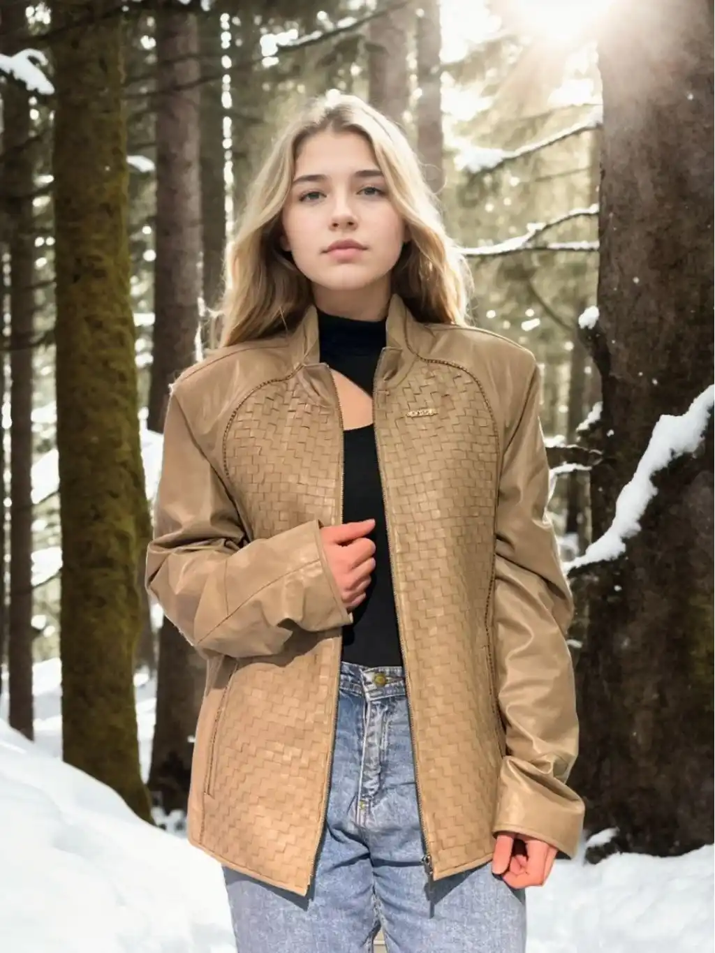 Kadın Fileli Deri Ceket - Krem