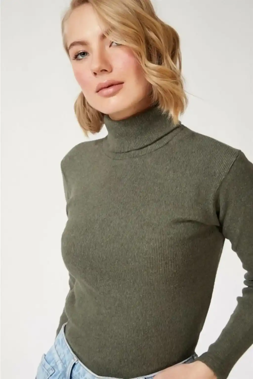 Kadın Tam Boğazlı Fitilli Likrali Kaşkorse Badi İnce Uzun Kollu Rahat Kazak - Haki