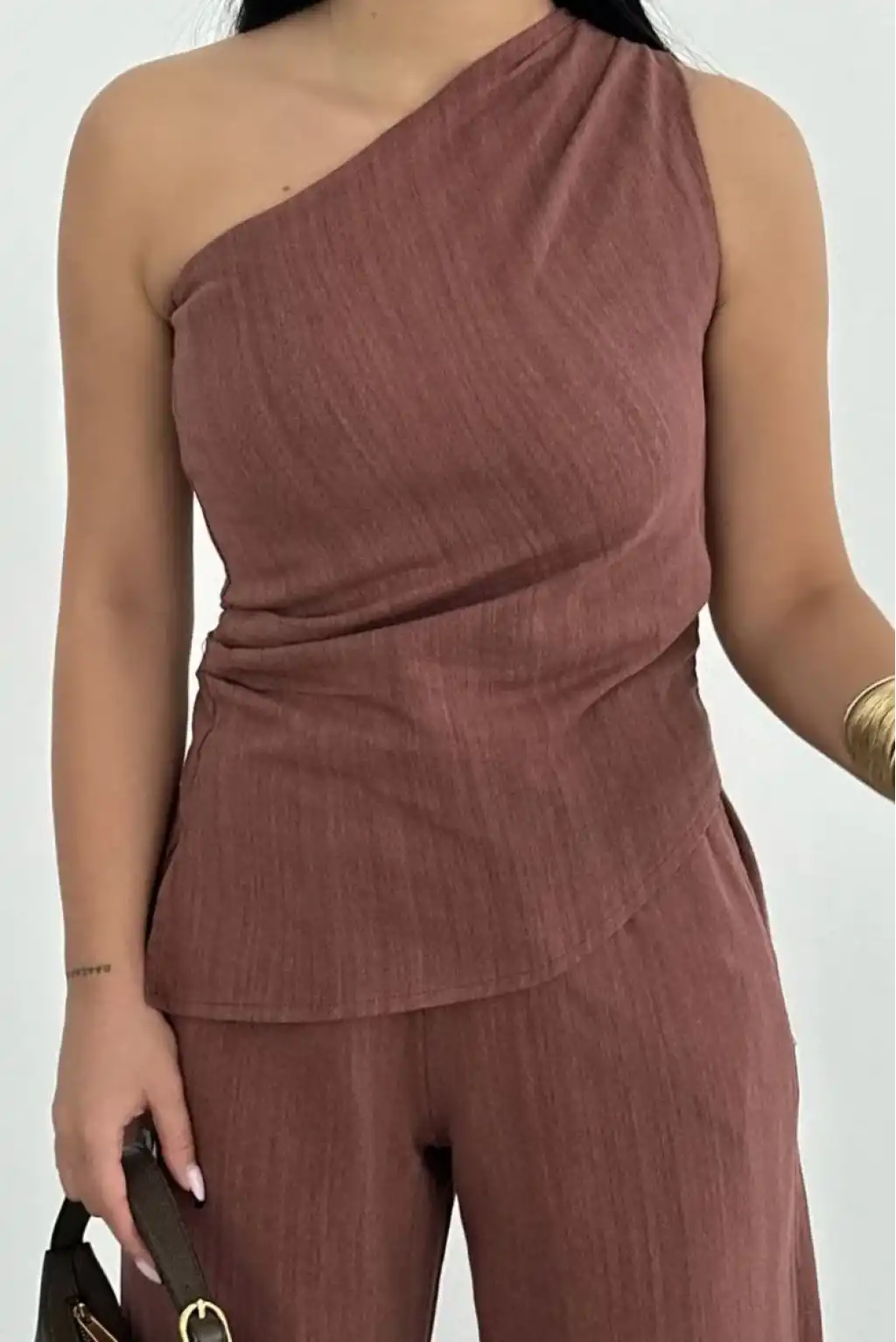 Kadın Keten Asimetrik Tek Omuzlu Bluz Pantalon Takım- Bordo