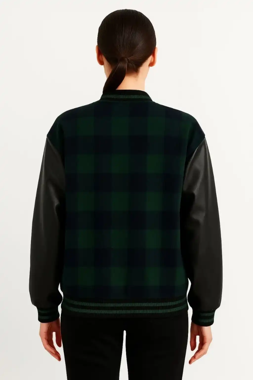 Kadın Kolej Ceket – Kareli Oduncu Kumaş, Kolları Suni Deri, Fermuarlı, İçi Kapitone Astarlı, Nakışlı Oversize Bahar & Kış Stil - Haki
