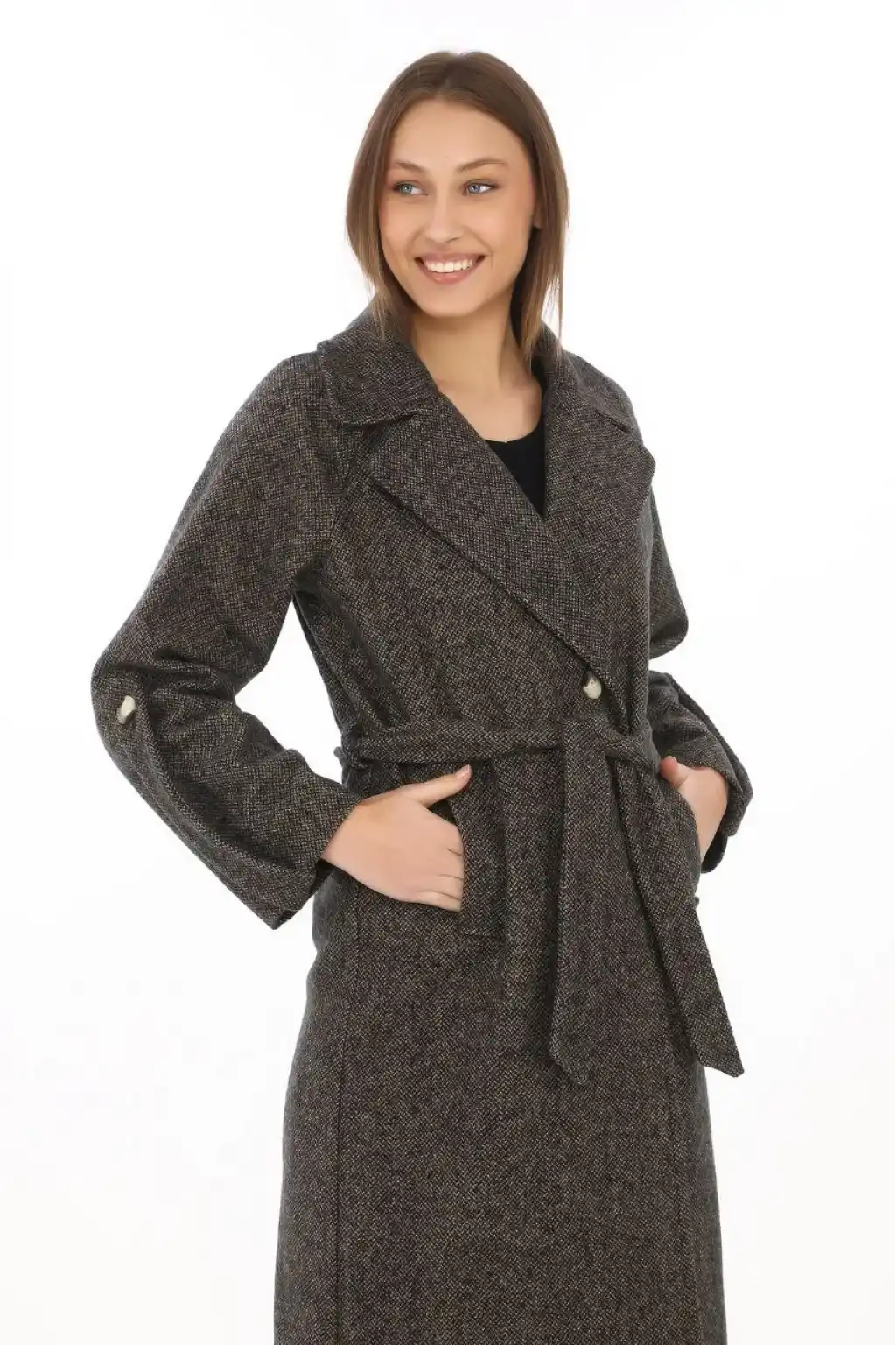 • Kadın Kolu Apoletli Astarlı Kaşmir Kaşe Kaban - Füme