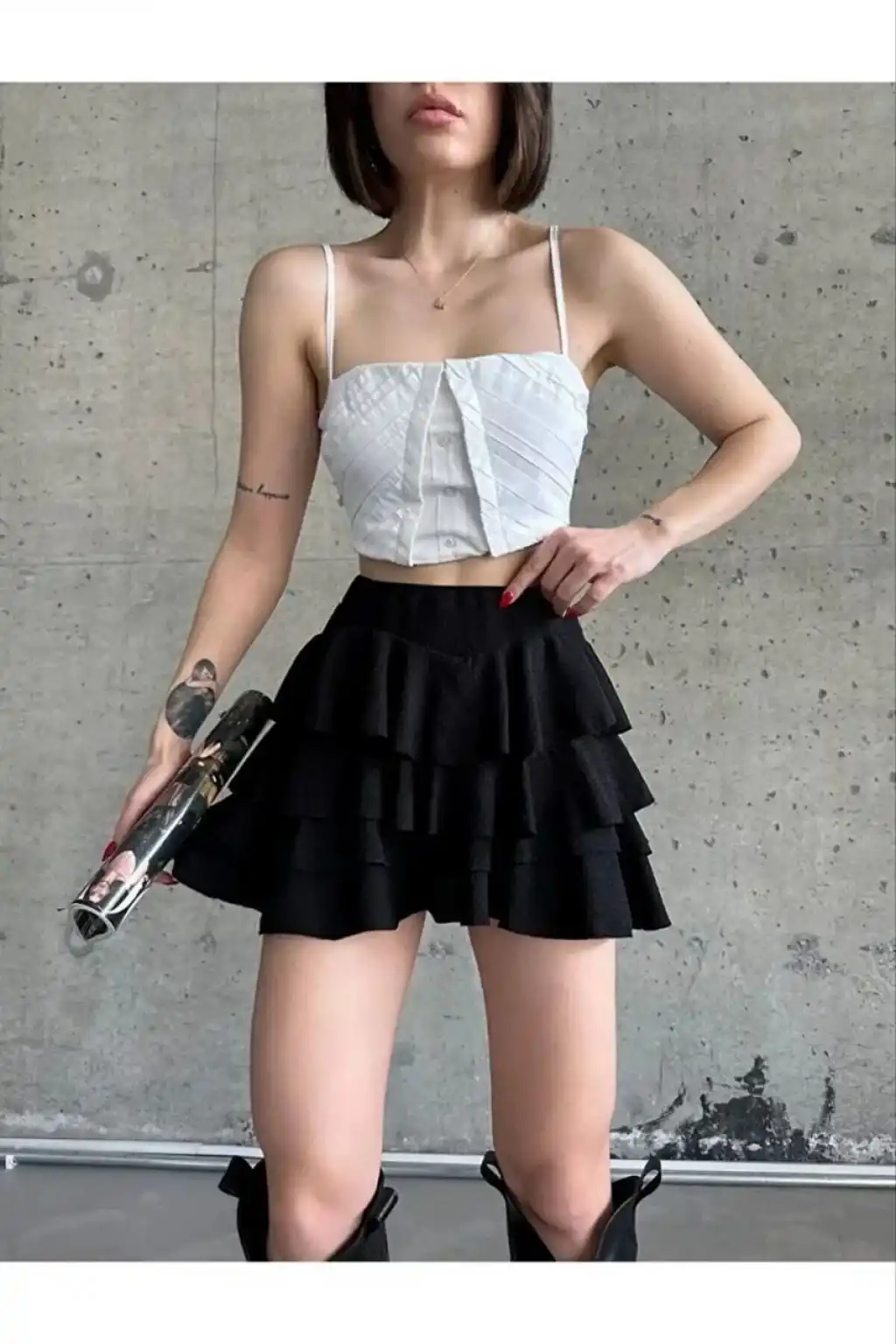 Kadın Siyah Katlı Mini Fırfıtlı Etek Lastikli Yüksel Bel, Volanlı Tasarım, Rahat Kalıp, Günlük ve Şık Kombinelere Uygun Yazlık Etek - Siyah