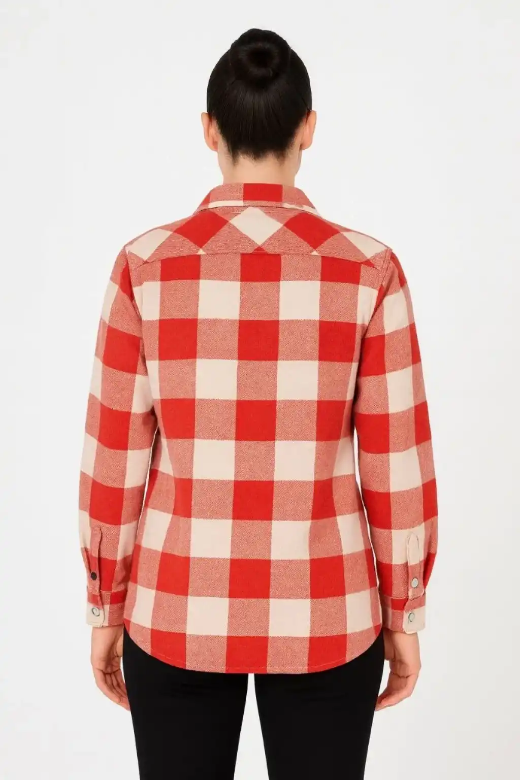 Kadın Oduncu Gömlek – Uzun Kollu, Şardonlu Kumaş, Kırmızı Beyaz Kareli Desen, Regular Fit, Çift Cepli, Manşetli Günlük Şık Stil - Bordo