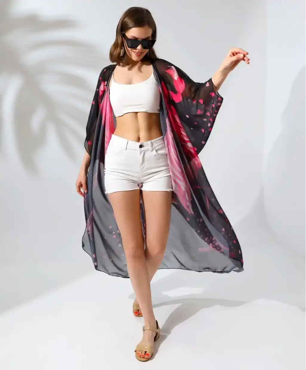 Kadın Baskılı Şifon Kimono Elbise - Siyah