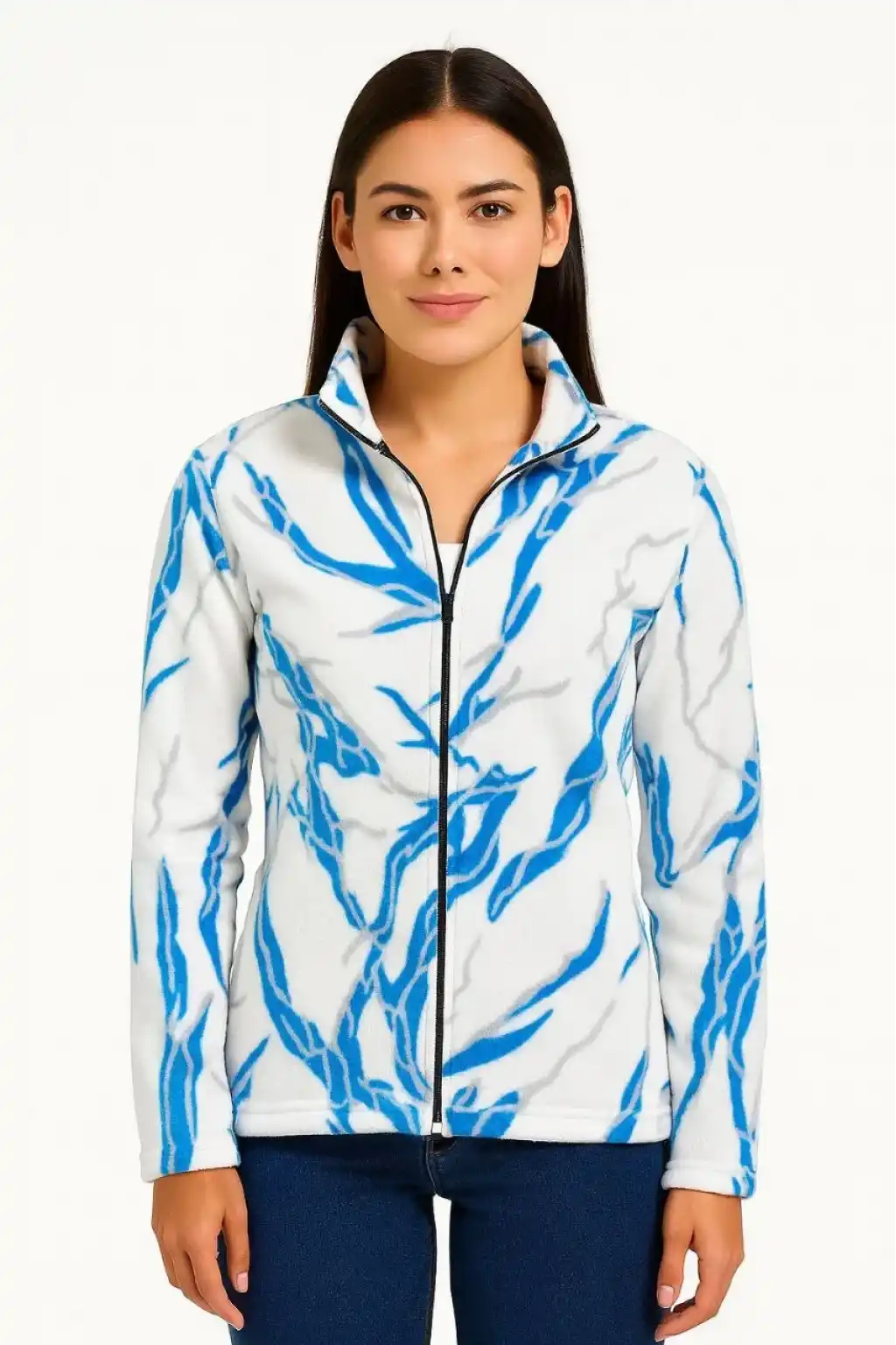 Kadın Tam Fermuarlı Desenli Polar Sweat Lightning Desen Yakalı, Uzun Kollu, Oversize Rahat Kalıp - Beyaz