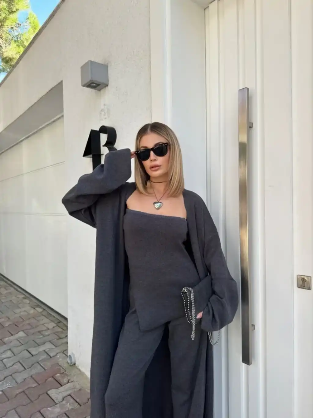 Osy Modal Yumuşak Dokulu Kumaş Bisiklet Yaka T-shirt Bol paça Pantalon ikili Takım - Boyalı Gri