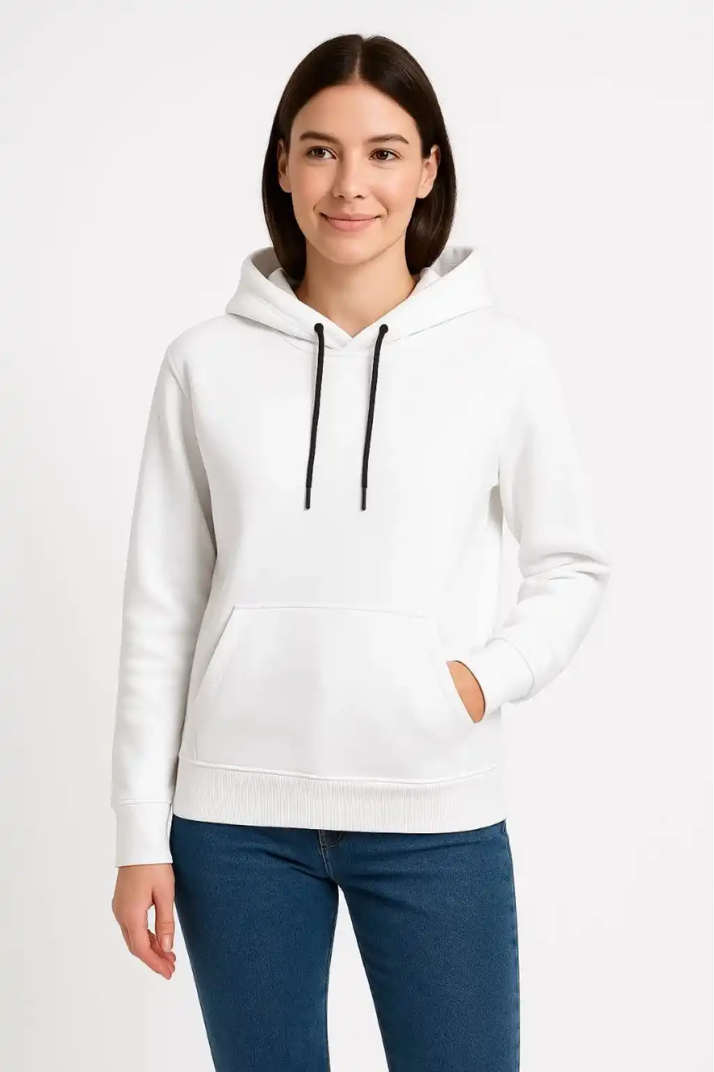 Kadın Üç İplik Kapüşonlu Kanguru Çepli SweatShirt hoodie - Beyaz