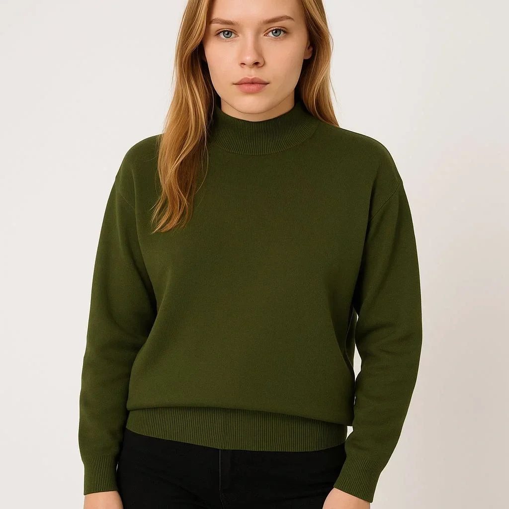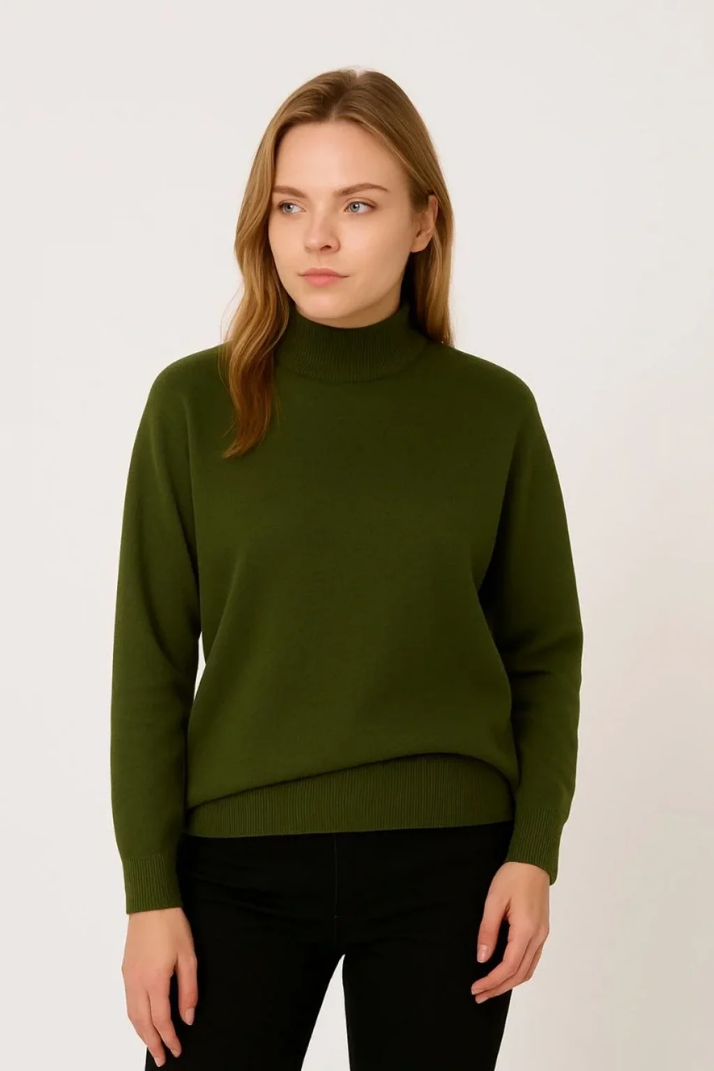 • Kadın Yarım Boğaz Triko Kazak yumuşak dokulu Pamuklu ince Dokuma, uzun kollu Rahat Regular kalıp - Haki