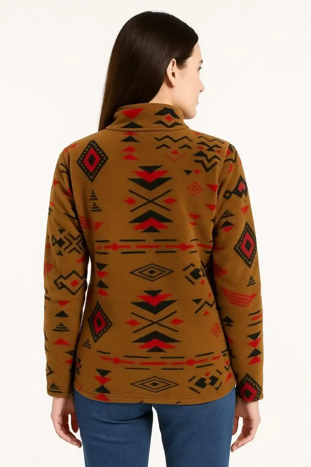 Kadın Yarım Fermuarlı Desenli Polar Sweat Tribal Etnik Desen Yakalı, Uzun Kollu, Oversize Rahat Kalıp - Kahverengi