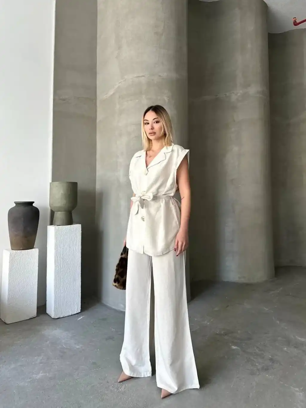 Keten Sıfır Kol Kuşaklı Ceket Pantolon ikili Takım - Beyaz